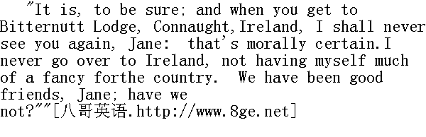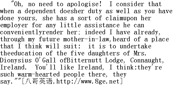 呵--不必道歉!我认为一个下人把工作做得跟你自己一样出色时,她就有权要求雇主给予一点容易办到的小小帮助。其实我从未来的岳母那儿听到一个适合你去的地方。就是爱尔兰康诺特的苦果村,教迪奥尼修斯.奥加尔太太的五个女儿,我想你会喜欢爱尔兰的。他们说,那里的人都很热心。" "It is a long way off, sir."" 离这儿很远呢,先生。" "No matter--a girl of your sense will not object to the voyage orthe distance."" 没有关系--像你这样一个通情达理的姑娘是不会反对航程或距离的。" "Not the voyage, but the distance: and then the sea is a barrier--"" 不是航程,而是距离。还有大海是一大障碍--" "From what, Jane?"" 离开什么地方,简?"