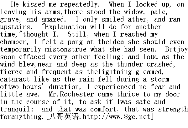 他吻了我,吻了又吻。我离开他怀抱抬起头来一看,只见那位寡妇站在那儿,脸色苍白,神情严肃而惊讶。我只朝她微微一笑,便跑上楼去了。"下次再解释也行,"我想。但是到了房间里,想起她一时会对看到的情况产生误解,心里便感到一阵痛楚。然而喜悦抹去了一切其他感情。尽管在两小时的暴风雨中,狂风大作,雷声隆隆,电光闪闪,暴雨如注,我并不害怕,并不畏惧。这中间罗切斯特先生三次上门,问我是否平安无事。这无论如何给了我安慰和力量。