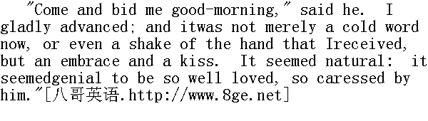 来,对我说声早安,"他说。我愉快地走上前。这回我所遇到的,不光是一句冷冰冰的话,或者是握一握手而已,而是拥抱和接吻。他那么爱我,抚慰我,显得既亲切又自然。