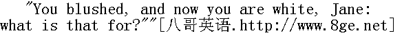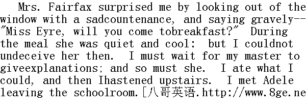 使我吃惊的是,费尔法克斯太太神色忧伤地望着窗外,十分严肃地说:"爱小姐,请来用早餐好吗?"吃饭时她冷冷地一声不吭。但那时我无法替她解开疑团。我得等我主人来解释,所以她也只好等待了。我勉强吃了一点,便匆勿上了楼,碰见阿黛勒正离开读书室。