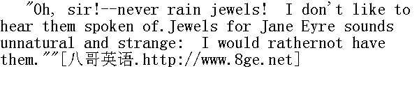 呵,先生!--别提珠宝了!我不喜欢说起珠宝。对简.爱来说,珠宝听来既不自然又很古怪,我宁可不要。"