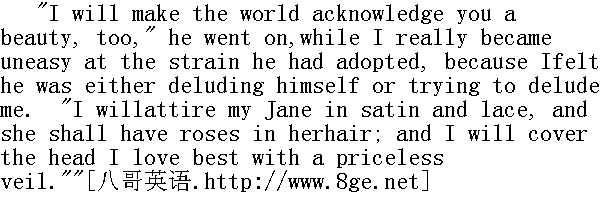 我还要全世界都承认,你是个美人,"他继续说,而我确实对他说话的口气感到不安,觉得他要不是自欺欺人,就是存心骗我。"我要让我的简.爱穿上缎子和花边衣服,头发上插玫瑰花,我还要在我最喜爱的头上,罩上无价的面纱。"