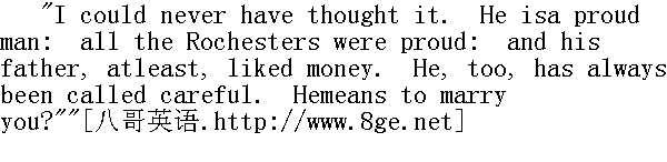 绝对想不到这点。他是一个很高傲的人。罗切斯特家族的人都很高傲,至少他的父亲很看重金钱,他也常被说成很谨慎。他的意思是要娶你吗?"