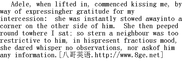阿黛勒一被拎进车子,便开始吻起我来,以表示对我替她说情的感激。她很快被藏到了靠他一边的角落里。她随后偷偷地朝我坐的地方扫视了一下,那么严肃的一位邻座使她很拘束。他眼下性情浮躁,所以她即使看到了什么,也不敢悄声说话,就是想要知道什么,也不敢问他。