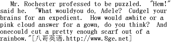 罗切斯特先生承认自己也搞不清楚了。"哼!"他说,"你会怎么办呢,阿黛勒?动动脑筋,想个应付的办法。一片白云,或者一片粉红色的云做件长袍,你觉得怎么样?一抹彩虹做条围巾绰绰有余。"
