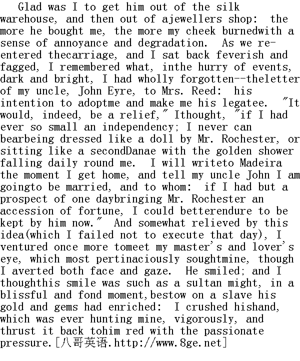 我庆幸自己出了丝绸货栈,随后又离开了一家珠宝店。他给我买的东西越多,我的脸颊也因为恼恨和堕落感而更加烧灼得厉害了。我再次进了马车,往后一靠坐了下来,心里热辣辣,身子疲惫不堪。这时我想起来了,随着光明和暗淡的岁月的流逝,我已完全忘却了我叔叔约翰.爱写给里德太太的信,忘了他要收养我让我成为他遗产继承人的打算。"如果我有那么一点儿独立财产的话。"我想,"说实在我会心安理得的。我绝不能忍受罗切斯特先生把我打扮成像玩偶一样,或者像第二个达那厄那样坐着,每天让金雨洒遍全身。我一到家就要写信到马德里,告诉我叔叔约翰,我要结婚了及跟谁结婚。如果我能期望有一天给罗切斯特先生带来一笔新增的财产,那我可以更好地忍受现在由他养起来了。"这么一想,心里便感到有些宽慰(这个想法那天没有实现),我再次大胆地与我主人兼恋人的目光相遇。尽管我避开他的面容和目光,他的目光却执拗地搜寻着我的。他微微一笑。我想他的微笑是一个苏丹在欣喜和多情的时刻,赐予他刚给了金银财宝的奴隶的。他的手一直在找寻我的手,我使劲握了它一下,把那只被满腔激情压红了的手甩了回去。