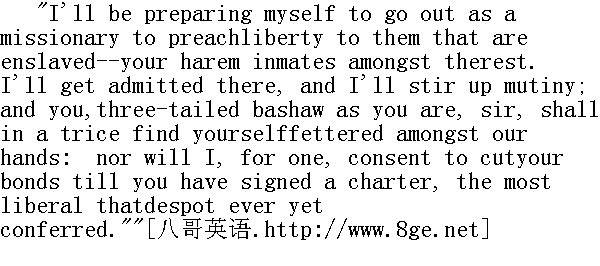 我会收拾行装,出去当个传教士,向那些被奴役的人-一你的三宫六院们,宣扬自由。我会进入后宫,鼓动造反。纵然你是三尾帕夏,转眼之间,你会被我们的人戴上镣铐,除非你签署一个宪章,有史以来的专制君王所签发的最宽容的宪章,不然至少我是不会同意砸烂镣铐的。"