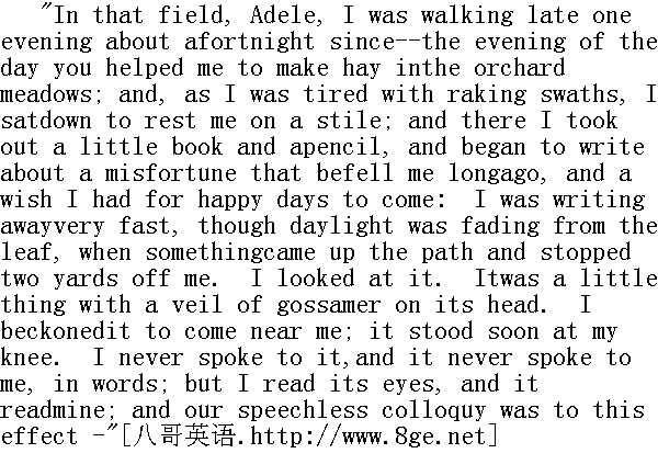 在那边田野上,阿黛勒,两星期前的一个晚上,我溜达得晚了--就是你帮我在果园草地里晒干草的那天晚上。我耙着干草,不觉累了,便在一个草堆上躺下来休息一会。当时我取出一本小书和一枝铅笔,开始写起很久以前落到我头上的不幸,和对未来幸福日子的向往。我写得很快,但阳光从树叶上渐渐隐去,这时一个东西顺着小径走来,在离我两码远的地方停了下来。我看了看它,原来是个头上罩了薄纱的东西。我招呼它走近我,它很快就站到了我的膝头上,我没有同它说话,它也没有同我说话,我猜透它的眼神,它也猜透了我的眼神。我们之间无声的谈话大致的意思是这样: