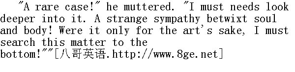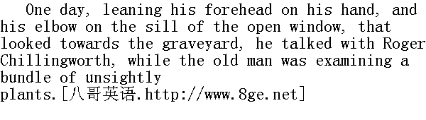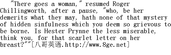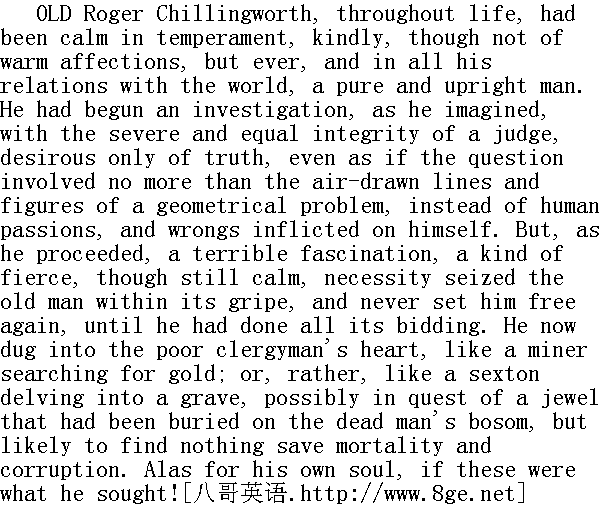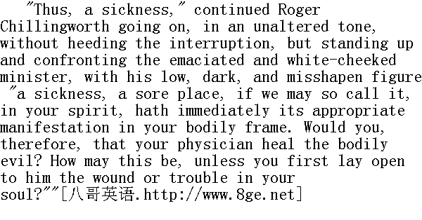 那边走着一个妇人,"罗杰·齐灵渥斯停了一会儿后接着说,"她不论有什么过错,绝不会被你认为如此难以忍受的隐蔽着的负罪感所左右。你看,海丝特·白兰是不是胸前佩戴了那红字,就不那么痛苦了呢?" "I do verily believe it," answered the clergyman. "Nevertheless, I cannot answer for her. There was a look of pain in her face, which I would gladly have been spared the sight of. But still, methinks, it must needs be better for the sufferer to be free to show his pain, as this poor woman Hester is, than to cover it all up in his heart."There was another pause; and the physician began anew to examine and arrange the plants which he had gathered." 我的确十分相信这一点,"牧师回答说。"不过我无法为她作答。她面孔上有一种痛楚的表情,那是我不情愿看到的。话说回来,我认为,一个受折磨的人能够象这可怜的妇人海丝特这样,有自由来表达自己的痛苦,总比全都闷在心里要强。"又是一阵停顿;医生开始重新动手检查和整理他采集来的植物。 "You inquired of me, a little time agone," said he, at length, "my judgment as touching your health."" 刚才你在问我,"他终于开口说,"我对你的健康有何看法。" "I did," answered the clergyman, "and would gladly learn it. Speak frankly, I pray you, be it for life or death."" 是啊,"牧师回答说,"我很乐于听一听。我请你坦率地讲出来,不管我是该活还是该死。"' "Freely, then, and plainly," said the physician, still busy with his plants, but keeping a wary eye on Mr. Dimmesdale, "the disorder is a strange one; not so much in itself, nor as outwardly manifested- in so far, at least, as the symptoms have been laid open to my observation. Looking dally at you, my good sir, and watching the tokens of your aspect, now for months gone by, I should deem you a man sore sick, it may be, yet not so sick but that an instructed and watchful physician might well hope to cure you. But- I know not what to say- the disease is what I seem to know, yet know it not."" 那我就坦率直陈吧,"医生说着,一边仍然忙着摆弄他那些药草,一边始终不动声色地睨视着丁梅斯代尔先生,"你的身体失调很奇怪,症候本身并不严重,也不象表现出来的那样厉害--到目前为止,至少我所观察到的症状是如此。我的好先生,我每日都在观察你,注意你的表象,如今已经有几个月过去了,我应该说你是一个病得很重的人,不过也还没有病到连一个训练有素而且克尽职守的医生都感到无望和不治的地步。可是--我不知道说什么才是--这病我似乎知道,可又不明白。"