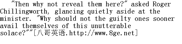 那么,何必不及时说出来呢?"罗杰·齐灵渥斯平静地斜睨着牧师说。"有负罪感的人为什么不尽早地让自己获得这种难言的慰藉呢?" "They mostly do," said the clergyman, griping hard at his breast, as if afflicted with an importunate throb of pain. "Many, many a poor soul hath given its confidence to me, not only on the deathbed, but while strong in life, and fair in reputation. And ever, after such an outpouring, oh, what a relief have I witnessed in those sinful brethren! even as in one who at last draws free air, after long stifling with his own polluted breath. How can it be otherwise? Why should a wretched man, guilty, we will say, of murder, prefer to keep the dead corpse buried in his own heart, rather than fling it forth at once, and let the universe take care of it?""Yet some men bury their secrets thus," observed the calm physician." 他们大多能这么做,"牧师一边说着,一边紧紧捂住自己的心口,象是有揪心的疼痛纠缠着他。"许许多多可怜的灵魂向我作过仟悔,不仅是在生命弥留的病倔上,而且也在精力旺盛、名声良好的时刻。何况,我还亲眼看到,在作了这样一番倾诉之后,那些负罪的兄弟们有多么轻松!就象是被自己污浊的呼吸长时间窒息之后,终于吸进了自由的空气。还能是别的情况吗?一个倒霉的人,比如说犯了谋杀罪吧,怎么可能宁愿把死尸埋在自己心中,而不肯把尸体马上抛出去,听凭世界去安排呢!""然而,有些人就是这样埋葬着自己的秘密的,"那安详的医生评论着。 "True; there are such men," answered Mr. Dimmesdale. "But, not to suggest more obvious reasons, it may be that they are kept silent by the very constitution of their nature. Or- can we not suppose it?- guilty as they may be, retaining, nevertheless, a zeal for God's glory and man's welfare, they shrink from displaying themselves black and filthy in the view of men; because, thenceforward, no good can be achieved by them; no evil of the past be redeemed by better service. So, to their own unutterable torment, they go about among their fellow-creatures, looking pure as new-fallen snow; while their hearts are all speckled and spotted with iniquity of which they cannot rid themselves."" 确实;有这种人,"丁梅斯代尔先生回答说。"不过,不必去设想更加明显的原因,我们就可以说,他们之所以缄口不言,正是出于他们的本性。或者--我们能不能这样假设呢?--他们尽管有着负罪感,然而却保持着对上帝的荣光和人类的福扯的热情,他们畏畏缩缩,不肯把自己的阴暗和污秽展现在人们眼前;因为,如此这般一来,是做不出任何善举的,而且,以往的邪恶也无法通过改过来赎罪。于是,他们默默忍受着难言曲折磨,在同伴中走来走去,表面象新落下的雪一般地纯洁,而内心却沾满了无法洗刷的斑痕。" "These men deceive themselves," said Roger Chillingworth, with somewhat more emphasis than usual, and making a slight gesture with his forefinger. "They fear to take up the shame that rightfully belongs to them. Their love for man, their zeal for God's service- these holy impulses may or may not coexist in their hearts with the evil inmates to which their guilt has unbarred the door, and which must needs propagate a hellish breed within them. But, if they seek to glorify God, let them not lift heavenward their unclean hands! If they would serve their fellow-men, let them do it by making manifest the power and reality of conscience, in constraining them to penitential self-abasement! Wouldst thou have me to believe, O wise and pious friend, that a false show can be better- can be more for God's glory, or man's welfare- than God's own truth? Trust me, such men deceive themselves!"" 这些人在自欺,"罗杰·齐灵渥斯用异乎寻常的强调口吻说,还伸出食指轻轻比了一下。"他们不敢于接受理应属于他们自己的耻辱。他们对人类的爱,他们为上帝服务的热忱--这种种神圣的冲动在他们的内心中,或者可以或者无法同邪恶的伙伴同处共存,然而这些邪恶的伙伴既是他们的罪孽开门放进来的,就必然会在他们心中繁衍起一个魔鬼的种籽。不过,要是他们追求为上帝增辉添光,那就不要把肮脏的双手朝天举起吧!要是他们想为同伴们服务,那就先强制自己仟悔他们的卑下,以表明良心的力量和存在吧!噢,明智和虔诚的朋友,你难道让我相信,虚伪的表现比起上帝自己的真理能够对上帝的荣光和人类的福扯更有好处吗?相信我吧,这种人是在自欺!" "It may be so," said the young clergyman, indifferently, as waiving a discussion that he considered irrelevant or unseasonable. He had a ready faculty, indeed, of escaping from any topic that agitated his too sensitive and nervous temperament. "But, now, I would ask of my well-skilled physician, whether, in good sooth, he deems me to have profited by his kindly care of this weak frame of mine?"" 可能是这样的,"年轻的牧师谈淡地说,象是放弃了这个他认为不相干和没道理的讨论。的确,他总有一种本领,能够随时摆脱使他那过于敏感和神经质的气质激动起来的任何话题。"不过,目前嘛,我例要向我的技艺高超的医生讨教一下,他对我的赢弱的体格的好心关照,是否当真叫我获益了呢?"