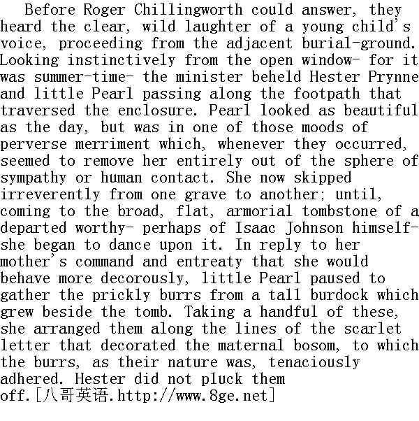 罗杰·齐灵渥斯还没有来得及回答,就听到从邻近的墓地里传来了一个小孩子的清澈而狂野的笑声。当时正是夏天,牧师不自主地从打开的窗子向外面望去,看到海丝特·白兰和小珠儿在穿越围栏的小径上走着。珠儿的模样如白昼一般美丽,但处于那种调皮任性的兴致之中,每当此刻,她便象完全脱离了人性的共鸣与交往的范围。此时她正大不敬地从一个坟墓跳到另一个坟墓;终于来到一位逝去的大人物--说不定正是艾萨克,约翰逊本人--的宽大、平整、带纹章的墓石跟前,在那上面跳起舞来。听到她母亲又是命令又是恳求地要她放规矩些,小珠儿才不再跳舞,从长在墓旁的一株高大的牛蒡上采集多刺的果实。她摘了满满一把之后,便在缀在母亲胸前的红字周围,沿着笔画一一插满,这些带刺的牛蒡便牢牢地扎在上面了。海丝特并没有把它们取下。 Roger Chillingworth had by this time approached the window, and smiled grimly down."There is no law, nor reverence for authority, no regard for human ordinances or opinions, right or wrong, mixed up with that child's composition," remarked her, as much to himself as to his companion. "I saw her, the other day, bespatter the Governor himself with water, at the cattle-trough in Spring Lane. What, in Heaven's name, is she? Is the imp altogether evil? Hath she affections? Hath she any discoverable principle of being?" 罗杰·齐灵渥斯这时已走到窗前,面带狞笑地向下望着。"在那孩子的气质中,根本没有法律,没有对权威的敬重,对于人类的法令或意向,不管正确与否,也不屑一顾,"他这样讲着,与其说是在同他的同伴谈话,倒更象是自言自语。"有一天,我看到她在春巷的畜槽边,竟然往总督身上泼水。我的天,她究竟是个什么东西呢?这小鬼是不是彻头彻尾地邪恶了?她有感情吗?在她身上能看到什么人性原则吗?" "None- save the freedom of a broken law," answered Mr. Dimmesdale, in a quiet way, as if he had been discussing the point within himself. "Whether capable of good I know not."" 完全没有--只有把法律破坏得支离破碎的自由,"丁梅斯代尔先生回答说,其态度之安详,简直象是对此自问自答。"至于能否为善,我可就不得而知了。" The child probably overheard their voices; for, looking up to the window, with a bright, but naughty smile of mirth and intelligence, she threw one of the prickly burrs at the Reverend Mr. Dimmesdale. The sensitive clergyman shrunk, with nervous dread, from the light missile. Detecting his emotion, Pearl clapped her little hands, in the most extravagant ecstasy. Hester Prynne, likewise, had involuntarily looked up; and all these four persons, old and young, regarded one another in silence, till the child laughed aloud, and shouted, "Come away, mother! Come away, or yonder old Black Man will catch you! He hath got hold of the minister already. Come away, mother, or he will catch you! But he cannot catch little Pearl!" 那孩子可能是远远听到了他俩的声音;因为她抬头看着窗户,面带欢快而聪明的顽皮笑容,朝丁梅斯代尔牧师先生扔上一颗带刺的牛蒡。那敏感的牧师怀着神经质的恐惧,将身子一缩,躲开了那轻飘的飞弹。珠儿发现了他的激动,在极度狂喜之中,拍起了小手。海丝特·白兰也同样禁不住始眼来看;于是这老老少少四个人便默默地互相瞅着;后来,孩子出声笑了,还大叫着--"走吧,妈妈!走吧,要不,那老黑人就抓住你了!他已经抓住了牧师。走吧,妈妈,要不他就抓住你了!可他抓不住小珠儿!" So she drew her mother away, skipping, dancing, and frisking fantastically, among the hillocks of the dead people, like a creature that had nothing in common with a bygone and buried generation, nor owned herself akin to it. It was as if she had been made afresh, out of new elements, and must perforce be permitted to live her own life, and be a law unto herself, without her eccentricities being reckoned to her for a crime. 于是她在死者的坟墓间蹦蹦跳跳,欢快雀跃地拽着她母亲走开了,她那出奇的劲头似乎说明她与那逝去并埋葬的一代毫无共同之处,也不承认她自己与他们同属一个族类。仿佛她是由新元素刚刚做成的,因此必得获准去过她自身的生活,并自有其定法,面不能将她的怪异看作是一种罪过。