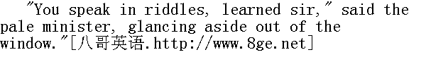 你是在打哑谜,博学的先生,"牧师斜瞥着窗外说。 "Then, to speak more plainly," continued the physician, "and I crave pardon, sir- should it seem to require pardon- for this needful plainness of my speech. Let me ask, as your friend- as one having charge, under Providence, of your life and physical well-being- hath all the operation of this disorder been fairly laid open and recounted to me?"" 那我就说得再明确些,"医生继续说,"出于我谈话所不得不有的坦率,我要请你原谅,先生--如果看来确实需要的话。作为你的朋友--作为受命于天,对你的生命和身体健康负有责任的人,我来问问你,你是否已经把你的全部症状暴露给我并向我详加说明了呢?" "How can you question it?" asked the minister. "Surely, it were child's play, to call in a physician, and then hide the sore!"" 你怎么能这样盘问呢?"牧师问道。"的确,请来医生,却又向他隐瞒病情,岂不成了儿戏嘛!" "You would tell me, then, that I know all?" said Roger Chillingworth deliberately, and fixing an eye, bright with intense and concentrated intelligence, on the minister's face. "Be it so! But, again! He to whom only the outward and physical evil is laid open, knoweth, oftentimes, but half the evil which be is called upon to cure. A bodily disease, which we look upon as whole and entire within itself, may, after all, be but a symptom of some ailment in the spiritual part. Your pardon, once again, good sir, if my speech give the shadow of offence. You, sir, of all men whom I have known, are he whose body is the closest conjoined, and imbued, and identified, so to speak, with the spirit whereof it is the instrument."" 那么,你就是说,我已经全部了然了?"罗杰·齐灵渥斯故意这样说着,同时用透着精明的炯炯目光盯着牧师的面孔。"但愿如此吧!不过,我还是要说!只了解病症表象的人;通常也不过只掌握了要他医治的疾病的一半症状。一种由体上的疾病,我们以为是全部症状了,其实呢,很可能只是精神上某种失调的征候。如果我的话有丝毫冒犯的话,我的好先生,就再次请你原谅。先生,在我所认识的一切人当中,你的肉体同你的精神,可啤说是最相融熔、合二而一的了,对你而言,身体不过是精神的工具罢了。" "Then I need ask no further," said the clergyman, somewhat hastily rising from his chair. "You deal not, I take it, in medicine for the soul!"" 这样看来,我就不必多问了,"牧师说着,有点匆忙地从椅子上站起身。"我是这样理解的,你并不经营治疗灵魂的药物!"