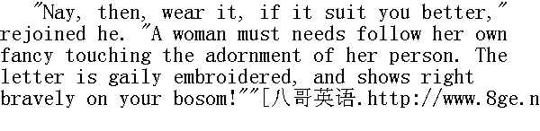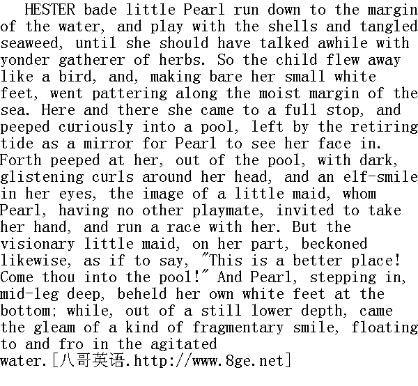 海丝特打发小珠儿跑到水边去玩贝壳和缠结的海藻,好让她同那边那采药人谈一会儿话。那孩子便象鸟儿般地飞了开去,她那双赤裸着的白白的小脚丫,一路拍着水在潮湿的海边跑着。她不时停下身来,把退潮留下的水洼当作镜子,好奇地朝里面照着她自己的面孔。水洼里,一个满头长着乌黑闪亮的鬃发、眼中露着小精灵般微笑的小姑娘,在朝她窥视,珠儿由于没有别的玩伴,便伸手邀她同自己进行一场赛跑。但那映象的小鼓娘,也同样和她伸手招呼,仿佛在说:"这地方更好些!你到水洼里来吧!"珠儿一脚踏进去,水没到了膝盖,她看见的只是水底的自己的白脚丫;同时,从更深的一层水下,映出了一种支离破碎的微笑,在动荡的水中上下漂浮闪动。 Meanwhile, her mother had accosted the physician. 与此同时,她母亲已和那医生搭话了。 "I would speak a word with you," said she- "a word that concerns us much."" 我想跟你谈一谈,"她说,"谈谈同我们至关紧要的事。" "Aha! and is it Mistress Hester that has a word for old Roger Chillingworth?" answered he, raising himself from his stooping posture. "With all my heart! Why, mistress, I hear good tidings of you, on all hands! No longer ago than yester-eve, a magistrate, a wise and godly man, was discoursing of your affairs, Mistress Hester, and whispered me that there had been question concerning you in the council. It was debated whether or no, with safety to the common weal, yonder scarlet letter might be taken off your bosom. On my life, Hester, I made my entreaty to the worshipful magistrate that it might be done forthwith!"" 啊哈!原来是海丝特太太有话要和老罗杰·齐灵渥斯说么?"他直起腰来回答说。"高兴之极!噢,太太,我从各处都听到有关你的好消息!就在昨天晚上,一位长官,一位圣明的人,还谈起了你的事,海丝特太太,他悄悄告诉我,在议会中曾经提及有关你的问题:大家议论起,要是把你胸前的红字取下来,会不会对公众的好运有妨碍。我敢发誓,海丝特,我当即恳求那可敬的长官,这事应予立即施行!" "It lies not in the pleasure of the magistrates to take off this badge." calmly replied Hester. "Were I worthy to be quit of it, it would fall away of its own nature, or be transformed into something that should speak a different purport."" 那些长官们可不乐于取下这徽记,"海丝特平静地应道。 "要是我有资格把这玩艺儿取下来,它就会自然而然地落下去,或是变成表示别的意思的东西了。"