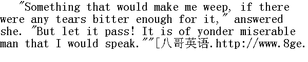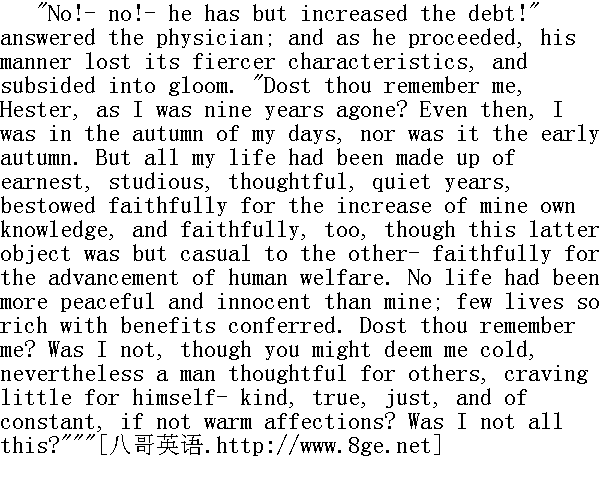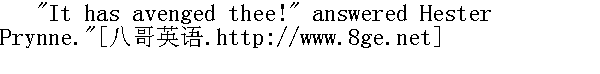 没有!--没有!他只不过增加了他的负债!"那医生回答说;在他接下去说着的时候,他的神情不再是恶狠狠的,而变得阴郁了。"你还记得我九年前的样子吗,海丝特?即使在那时;我也到了垂暮之秋,而且还不是初秋。但我的全部生活都是由真诚、勤学、沉思和宁静的岁月所构成的,我忠实地将其奉献给为自己增加知识,也同样忠实地将其奉献给为人类造福--虽说这后一个目标与前一个相比只是附带的。谁也比不上我生活得那样平和,那样纯真;很少有人象我那样生活得富于裨益。你还记得那时的我吗?虽说你可能认为我冷酷无情,难道我不是为他人着想,很少替自己打算吗?--就算我不是温情脉脉,难道我不是善良、真诚、正直,对爱情始终不渝的人吗?过去的我难道不就是这样子吗?" "All this, and more," said Hester." 是这样子的,而且还不只这些,"海丝特说。 "And what am I now?" demanded he, looking into her face, and permitting the whole evil within him to be written on his features. "I have already told thee what I am! A fiend! Who made me so?" "It was myself!" cried Hester, shuddering. "It was I, not less than he. Why hast thou not avenged thyself on me?"" 可我现在成了什么样子呢?"他紧盯着她的面孔,逼问着,同时让他内心的全部邪恶都无保留地表露在他的外貌上。"我已经告诉过你我是什么了!一个恶魔!是谁把我弄成这样子的?""就是我!"海丝特周身战抖着说。"是我!我的责任并不比他小。可你为什么不对我报复呢?" "I have left thee to the scarlet letter," replied Roger Chillingworth. "If that have not avenged me, I can do no more!"" 我把你留给了红宇,"罗杰·齐灵渥斯回答说。"如果红字还不能为我出气,我也别无它法了!" He laid his finger on it, with a smile. 他面带微笑,把一个指头放在红字上面。