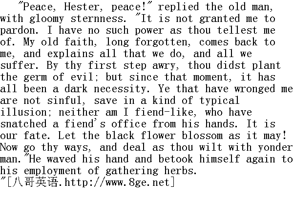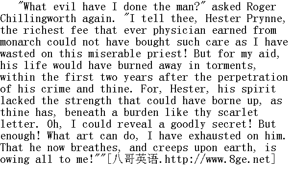 它已经替你报复了!"海丝特·白兰说。 "I judged no less," said the physician. "And now, what wouldst thou with me touching this man?"" 我正是这么看的,"那医生说。"那么,如今你要我对那个人怎么办呢?" "I must reveal the secret," answered Hester firmly. "He must discern thee in thy true character. What may be the result, I know not. But this long debt of confidence, due from me to him, whose bane and ruin I have been, shall at length be paid. So far as concerns the overthrow or preservation of his fair fame and his earthly state, and perchance his life, he is in thy hands. Nor do I- whom the scarlet letter has disciplined to truth, though it be the truth of red-hot iron, entering into the soul- nor do I perceive such advantage in his living any longer a life of ghastly emptiness, that I shall stoop to implore thy mercy. Do with him as thou wilt! There is no good for him- no good for me- no good for thee! There is no good for little Pearl! There is no path to guide us out of this dismal maze."" 我要揭露这一秘密,"海丝特坚定地回答说。"他应该辨清你的真实面目。其结果会如何,我并不知道。但我长期以来向他隐瞒真相的这笔债,现在总该偿还了--正是因为我才毁掉他的啊。至于他的良好的名声和他在世间的地位,或许还有他的生命,予取予夺都在你的掌握之中。我的情况就不一样了--红字已经使我皈依了真理,尽管那真理如熨铁一般火热,深源地烙进了我的灵魂,--而他那鬼一般空虚的生活再延迟下去,我也看不出还有什么好处,因此我也不会卑躬屈膝地乞求你的慈悲。你对他尽管随心所欲好了!对他不会有什么好处,一一对我不会有什么好处,--对你也没什么好处!对小珠儿不会有什么好处!没有任何指引我们跳出这阴惨的迷津的道路!" "Woman, I could well-nigh pity thee!" said Roger Chillingworth, unable to restrain a thrill of admiration too; for there was a quality almost majestic in the despair which she expressed. "Thou hadst great elements. Peradventure, hadst thou met earlier with a better love than mine, this evil had not been. I pity thee, for the good that has been wasted in thy nature!" " 女人,我满可以可怜你的!"罗杰·齐灵渥斯说,由于她表现出的绝望中有一种近乎庄严的气质,连他也不由得不肃然起敬了。"你具有了不起的天赋。如果你早些得到强过于我的爱,这件邪恶就不会发生了。我可怜你,因为你美好的天性横遭荒废!" "And I thee," answered Hester Prynne, "for the hatred that has transformed a wise and just man to a fiend! Wilt thou yet purge it out of thee, and be once more human? If not for his sake, then doubly for thine own! Forgive, and leave his further retribution to the Power that claims it! I said, but now, that there could be no good event for him, or thee, or me, who are here wandering together in this gloomy maze of evil, and stumbling, at every step, over the guilt wherewith we have strewn our path. It is not so! There might be good for thee, and thee alone, since thou hast been deeply wronged, and hast it at thy will to pardon. Wilt thou give up that only privilege? Wilt thou reject that priceless benefit?"" 我也同样地可怜你,"海丝特·白兰回答说,"因为仇恨已经把一个聪明而正直的人变成了恶魔!你还愿意把仇恨从心中排挤出去,再恢复成人吗?即使不是为了他的缘故,那么总是加倍地为了你自己嘛!你放宽容些,把对他来世的报应交给有极处理此事的神灵吧!我刚才说过了,象目前这样,无论对他,对你,或者对我,都不会有任何好处,我们是在这片阴惨的邪恶迷律中一起徘徊,在我们铺撤在路上的罪孽上每走一步都要跌跌撞撞。事情本不该这样的!由于你一直深深受到委屈,你就拥有一切极力来宽怨,你可以因此从中获益,而且只有你一人单独获益。你难道要放弃那唯一的特权吗?你难道要反对这没本钱的利益吗?"