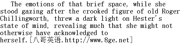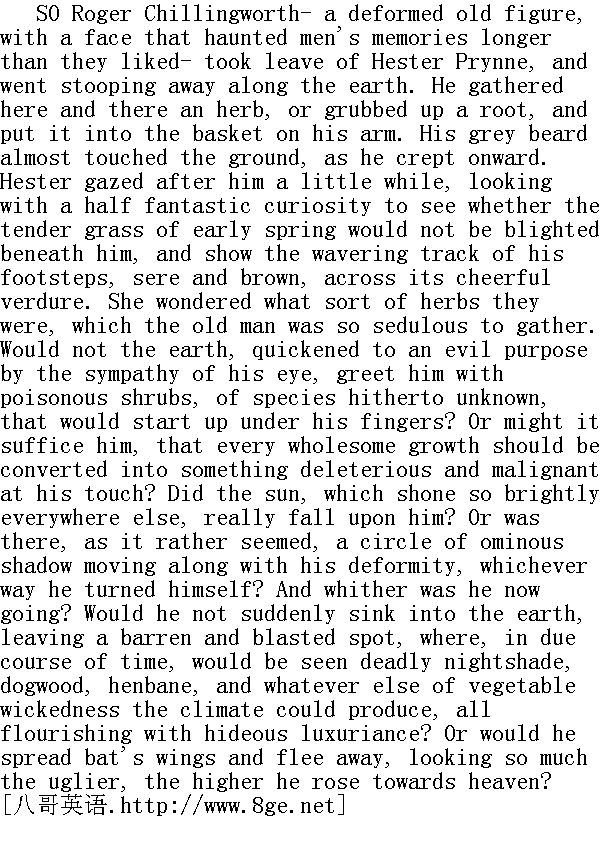就这样,罗杰·齐灵渥斯--那个身材畸形的老人,他那张面孔会长时间地萦绕在人们的脑海,想忘都忘不掉--离开了海丝特·白兰,一路弯着腰走开了。他东一处西一处地采集一棵药草或挖掘一个树根,然后装进他挎着的提篮里。他深猫着腰朝前走着,灰白的胡须几乎触到了地面。海丝特在他身后盯视了一小会儿,怀着一种有点想入非非的好奇心,想看清楚早春的嫩草会不会在他脚下枯萎,那一片欣欣向荣的葱翠会不会显出一条枯褐、弯曲的足迹。她不晓得那老人如此勤快地采集的是哪种药草。坟地会不会在他目光的感应下立刻产生邪意,在他手指的一触之下马上生出一种从不知名的毒草来迎接他呢?或者说,大地会不会把每一种良木益草在他接触之后都变成毒木莠草来满足他呢?那普照四方的明亮的太阳是不是也当真能照到他身上呢?或者说,是不是有一圈不样的阴影,当真象看上去的那样,始终伴随着他那畸形的身躯,任凭他走到哪里都如影随形呢?那么,现在他又往哪里去了呢?他会不会突然沉入地下?从而留下一块枯荒之地,很需要经过一段时间,才会看见龙葵、山茱萸、杀生草以及其它种种在这一气候中能够生长的毒草,可怕地滋生蔓延起来。或者说,他会不会展开蝙蝠的翅膀腾空飞去,飞得越高,样子越丑呢? "Be it sin or no," said Hester Prynne bitterly, as she still gazed after him, "I hate the man!"" 不管是不是罪过,"海丝特·白兰一边继续注视着他的背影,一边狠狠地说,"我反正恨这个人!" She upbraided herself for the sentiment, but could not overcome or lessen it. Attempting to do so, she thought of those long-past days, in a distant land, when he used to emerge at eventide from the seclusion of his study, and sit down in the firelight of their home, and in the light of her nuptial smile. He needed to bask himself in that smile, he said, in order that the chill of so many lonely hours among his books might be taken off the scholar's heart. Such scenes had once appeared not otherwise than happy, but now, as viewed through the dismal medium of her subsequent life, they classed themselves among her ugliest remembrances. She marvelled how such scenes could have been! She marvelled how she could ever have been wrought upon to marry him! She deemed it her crime most to be repented of, that she had ever endured, and reciprocated, the lukewarm grasp of his hand, and had suffered the smile of her lips and eyes to mingle and melt into his own. And it seemed a fouler offence committed by Roger Chillingworth, than any which had since been done him, that, in the time when her heart knew no better, he had persuaded her to fancy herself happy by his side. 她为这种感情而自责,但她既不能抑制也不能减少这种感情。为了克制这种感情,她回忆起那些早巳逝去的岁月,那是在遥远的土地上,那时候他每到傍晚便从幽静的书斋中出来,坐在他们家的壁炉旁,沉浸在他妻子容光焕发的娇笑之中。他那时常说,他需要在她的微笑中温暖自己,以便从他那学者的心中驱散长时间埋头书卷所积郁的寒气。这种情景也曾经作为幸福而出现过;但如今,透过她随之而来的生活的悲惨的折射,只能归类于她回忆中最不堪入目的部分了。她惊诧何以会有过这种情景!她惊诧自己何以会最终嫁给了他!她认为,她以前竟然忍受并回握了他那不冷不热的篡握,竟然以自己眉眼和嘴唇的微笑来迎合他的笑意,实在是她最应追悔的罪过。在她看来,罗杰·齐灵渥斯对她的触犯,就是在她不谙世事时便使她误以为追随在他身边便是幸福,而这比起他后来受到的伤害要大得多。 "Yes, I hate him!" repeated Hester, more bitterly than before. "He betrayed me! He has done me worse wrong than I did him!"" 是啊,我是恨他!"海丝特又重复了一句,口气更狠了。"他害苦了我!他伤我要比我伤他厉害得多!" Let men tremble to win the hand of woman, unless they win along with it the utmost passion of her heart! Else it may be their miserable fortune, as it was Roger Chillingworth's, when some mightier touch than their own may have awakened all her sensibilities, to be reproached even for the calm content, the marble image of happiness, which they will have imposed upon her as the warm reality. But Hester ought long ago to have done with this injustice. What did it betoken? Had seven long years, under the torture of the scarlet letter, inflicted so much of misery, and wrought out no repentance? 让那些只赢得女人首肯婚约但没有同时赢得她们内心最深处的激情的男人们发抖吧!他们会象罗杰·齐灵渥斯一样遭到不幸的:因为当某一个比他们更有力的接触唤醒她们的全部感知时,即使是他们当作温暖的现实而要加诸女人的那种平静的满足,那种坚如磐石的幸福形象,都要统统受到指责。但海丝特早就应该对这种不公乎处之泰然了。不公平又能怎样?难道在七年漫长的岁月中,在红字曲折磨下备受痛苦,还悟不出一些仟悔之意吗?