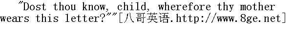 我不知道妈妈会不会问我这是什么意思!"珠儿想道。 Just then, she heard her mother's voice, and flitting along as lightly as one of the little sea-birds, appeared before Hester Prynne, dancing, laughing, and pointing her finger to the ornament upon her bosom. 就在这时,她听到了她母亲的呼唤,就象一只小海鸟似的一路轻快地跑跳着,来到海丝特·白兰的面前,又跳又笑地用手指着自己胸前的装饰。 "My little Pearl," said Hester, after a moment's silence, "the green letter, and on thy childish bosom, has no purport. But dost thou know, my child, what this letter means which thy mother is doomed to wear?"" 我的小珠儿,"海丝特沉默了一会儿之后说,"那绿色的字母,在你童稚的胸口是没有意义的。不过,我的孩子,你可知道你妈妈非戴不可的这个字母的意思吗?"。 "Yes, mother," said the child. "It is the great letter A. Thou hast taught me in the horn-book."" 知道的,妈妈,"那孩子说。"那是一个大写的A宇。你已经在字帖上教过我了。" Hester looked steadily into her little face; but, though there was that singular expression which she had so often remarked in her black eyes, she could not satisfy herself whether Pearl really attached any meaning to the symbol. She felt a morbid desire to ascertain the point. 海丝特目不转睛地盯着她的小脸;然而,孩子那黑眼睛中虽然带着平时极其独特的表情,她却说不准珠儿是否当真把什么意思同那象征联系到了一起。她感到有一种病态的欲望想弄明白这一点。