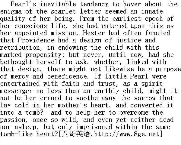 孩子,你知道你妈妈为什么要戴这个字母吗?" "Truly do I!" answered Pearl, looking brightly into her mother's face. "It is for the same reason that the minister keeps his hand over his heart!"" 我当然知道!"珠儿说着,闪光的眸子紧盯着她母亲的面孔。"这和牧师用手捂住心口都是出于同样的原因!" "And what reason is that?" asked Hester, half smiling at the absurd incongruity of the child's observation; but, on second thoughts, turning pale. "What has the letter to do with any heart, save mine?"" 那究竟是什么原因呢?"海丝特问道,起初还因为孩子那番话荒诞不经而面带微笑;但转念一想,面孔就苍白了。"除去我的心之外,这字母跟别人的心又有什么关系呢?" "Nay, mother, I have told all I know," said Pearl, more seriously than she was wont to speak. "Ask yonder old man whom thou hast been talking with! It may be he can tell. But in good earnest now, mother dear, what does this scarlet letter mean?- and why dost thou wear it on thy bosom?- and why does the minister keep his hand over his heart?"" 那我可不知道了,妈妈,我知道的全都说了,"珠儿说道,那神情比平时说话要严肃认真得多。"问问你刚刚同他谈话的那个老头儿吧!他也许能告诉你。不过,现在说真格的,我的好妈妈,这红字是什么意思呢?--为什么你要在胸前戴着它?--为什么牧师要把手捂在心口上?" She took her mother's hand in both her own, and gazed into her eyes with an earnestness that was seldom seen in her wild and capricious character. The thought occurred to Hester, that the child might really be seeking to approach her with childlike confidence, and doing what she could, and as intelligently as she knew how, to establish a meeting-point of sympathy. It showed Pearl in an unwonted aspect. Heretofore, the mother, while loving her child with the intensity of a soul affection, had schooled herself to hope for little other return than the waywardness of an April breeze; which spends its time in airy sport, and has its gusts of inexplicable passion, and is petulant in its best of moods, and chills oftener than caresses you, when you take it to your bosom; in requital of which misdemeanours, it will sometimes, of its own vague purpose, kiss your cheek with a kind of doubtful tenderness, and play gently with your hair, and then be gone about its other idle business, leaving a dreamy pleasure at your heart. And this, moreover, was a mother's estimate of the child's disposition. Any other observer might have seen few but unamiable traits, and have given them a far darker colouring. But now the idea came strongly into Hester's mind, that Pearl, with her remarkable precocity and acuteness, might already have approached the age when she could be made a friend, and entrusted with as much of her mother's sorrows as could be imparted, without irreverence either to the parent or the child. In the little chaos of Pearl's character, there might be seen emerging- and could have been, from the very first- the steadfast principles of an unflinching courage- an uncontrollable will- a sturdy pride, which might be disciplined into self-respect- and a bitter scorn of many things, which, when examined, might be found to have the taint of falsehood in them. She possessed affections, too, though hitherto acrid and disagreeable, as are the richest flavours of unripe fruit. With all these sterling attributes, thought Hester, the evil which she inherited from her mother must be great indeed, if a noble woman do not grow out of this elfish child. 她用双手握住她母亲的一只手,用她那狂野和任性的个性中少见的一本正经的神情盯着母亲的眼睛。这时海丝特突然闪过一个念头:这孩子也许当真在以她孩提的信任来寻求同自己接近,并且尽其智慧所能来建起一个同情的交汇点。这表现出珠儿的不同往常的另一副面孔。此前,做母亲的虽以极其专一的钟爱爱着她的孩子,却总在告诫自己,且莫指望得到比任性的四月的微风更多的回报--那微风以飘渺的运动来消磨时光,具有一种难以名状的突发的激情,会在心情最好时勃然大怒,当你放它吹进怀中时,经常是给你寒气而不是爱抚;为了补偿这种过失,它有时会出于模糊的目的,以一种值得怀疑的温柔,亲吻你的面颊,轻柔地抚弄你的头发,然后便跑到一边去作别的无所事事的举动,只在你的心中留下一种梦幻般的快感。何况,这还是母亲对她孩子的气质的揣摩呢。至于别的旁观者,恐怕不会看出什么讨人喜欢的品性,只能说出些糟糕得多的评价。但此时闯入海丝特脑海的念头是:珠儿早熟和敏感得出奇,或许已然到了可以作为朋友的年龄,可以尽其所能分担母亲的忧伤,而不会对母女任何一方造成不敬了。在珠儿那小小的混沌的个性中,或许可以见到开始呈现出--也可能从一开始就一直存在着--一种毫无畏缩、坚定不移的气质,一种无拘无束的意志,一种可以培养成自尊心的桀骜不驯的骄傲,而且对许多事物抱有一种极度的轻蔑,而对这些事物如果加以推敲,就可能会发现其甲确有虚伪的污点。她还具有丰富的情感,尽管至今还象末熟的果子那样酸涩得难以入口。海丝特自忖,这个小精灵似的孩子已经具备了这些纯正的秉赋,如若再不能成长为一个高贵的妇人,那就是她从母亲身上继承到的邪恶实在太大了。