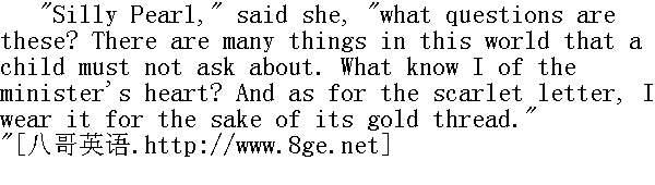 傻珠儿,"她说,"这是些什么问题呢?这世上有许多事情是一个小孩子不该问的。我怎么会知道关于牧师的心的事情呢?至于这红字嘛,我戴上是因为金线好看。" In all the seven bygone years, Hester Prynne had never before been false to the symbol on her bosom. It may be that it was the talisman of a stern and severe, but yet a guardian spirit, who now forsook her; as recognising that, in spite of his strict watch over her heart, some new evil had crept into it, or some old one had never been expelled. As for little Pearl, the earnestness soon passed out of her face. 在过去的七今年头中,海丝特·白兰还从来没有就她胸前的标记说过假话。很可能,那红字虽是一个严苛的符咒,但同时也是一个守护神,不过现在那守护神抛弃了她,正是由于看到了这一点,尽管红字依然严格地守在她心口,但某个新的邪恶已经钻了进去,或者说某个旧的邪恶始终没有被驱逐出来。至于小珠儿呢,那种诚挚的神情很快就从她脸上消失了。 But the child did not see fit to let the matter drop. Two or three times, as her mother and she went homeward, and as often at suppertime, and while Hester was putting her to bed, and once after she seemed to be fairly asleep, Pearl looked up, with mischief gleaming in her black eyes. 但那孩子仍不肯就此罢休。在她母亲领她回家的路上,她又问了两三次,在吃晚饭时和海丝特送她上床时又问了两三次,在她象是已经入睡之后又问了一次:珠儿抬起头来,黑眼睛中闪着捣蛋的光芒。 "Mother," said she, "what does the scarlet letter mean?"" 妈妈,"她说,"这红字到底是什么意思?" And the next morning, the first indication the child gave of being awake was by popping up her head from the pillow, and making that other inquiry, which she had so unaccountably connected with her investigations about the scarlet letter- 第二天一早,那孩子醒来的第一个表示,就是从枕头上猛地把头一抬,问起另外那个问题,不知为什么她总是把那个问题同探询红字的问题搅在一起--