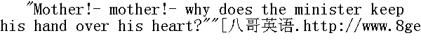 妈妈!--妈妈!--牧师于嘛总用手捂住心口呢?" "Hold thy tongue, naughty child!" answered her mother, with an asperity that she had never permitted to herself before. "Do not tease me; else I shall shut thee into the dark closet!" " 闭嘴,调皮鬼!"她母亲回答说,语气之严厉,是她以前从来不准自己有的。"别缠我了,要不我就把你关进橱柜里去了!"