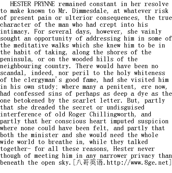 海丝特·白兰不管眼下有什么痛苦或日后有什么结果,也甘冒风险,一心要对丁梅斯代尔先生揭示那个钻到他身边的人的真实身分。她知道他有一个习惯,喜欢沿着半岛的岸边或邻近的乡间的山林中边散步边思考,但接连好几天,她都没能趁着这个时间找个机会同他交谈。当然,她就是到他自己的书斋去拜访,也不会引起谣言,更不会对牧师那圣洁的名声有什么影响,因为原本就有许多人到他的书斋中去仟侮,他们所招认的罪孽之深重,或许不亚于红字所代表的那种。然而,一来她担心老罗杰·齐灵渥斯会暗中或公然搅扰;一来她自己心里疑神疑鬼,虽说别人并不会猜测;一来她和牧师谈话时,两人都需要整个旷野来呼吸空气--出于这一切原因,海丝特从来没想过不在光天化日之下面在什么狭窄的私下场所去见他。 At last, while attending in a sick-chamber, whither the Reverend Mr. Dimmesdale had been summoned to make a prayer, she learnt that he had gone, the day before, to visit the Apostle Eliot, among his Indian converts. He would probably return, by a certain hour, in the afternoon of the morrow. Betimes, therefore, the next day, Hester took little Pearl- who was necessarily the companion of all her mother's expeditions, however inconvenient her presence- and set forth. 后来,她到一家病人的房中去帮忙,而丁梅斯代尔牧师先生先前也曾应邀去作道祈祷,她才在那里听说他已经在前一天就走了--到他的印第安信徒中拜访使徒艾略特去了。他可能要在第二天下午的某个时刻回来。于是,到了次日那个钟点,海丝特就带上珠儿出发了--只要母亲外出,不管带着她方便与否,她反正总是必不可少的伴侣。 The road, after the two wayfarers had crossed from the peninsula to the mainland, was no other than a footpath. It straggled onward into the mystery of the primeval forest. This hemmed it in so narrowly, and stood so black and dense on either side, and disclosed such imperfect glimpses of the sky above, that, to Hester's mind, it imaged not amiss the moral wilderness in which she had so long been wandering. The day was chill and sombre. Overhead was a grey expanse of cloud, slightly stirred, however, by a breeze; so that a gleam of flickering sunshine might now and then be seen at its solitary play along the path. This flitting cheerfulness was always at the farther extremity of some long vista through the forest. The sportive sunlight- feebly sportive, at best, in the predominant pensiveness of the day and scene- withdrew itself as they came nigh, and left the spots where it had danced the drearier, because they had hoped to find them bright. 这两个行路人穿过半岛踏上大陆之后,脚下便只有一条人行小径可走了。这条小路婉蜒伸入神秘的原始森林之中。树木紧紧夹位窄窄的小路,耸立在两旁,浓密蔽荫,让人举目难见青天。在海丝特看来,这恰是她多年来徘徊其中的道德荒野的写照。天气阴沉面寒冷。头上是灰蒙蒙的云天,时而被微风轻拂;因而不时可见缕缕阳光,孤寂地在小径上闪烁跳跃。这种转瞬即逝的欢快,总是闪现在森林纵深的远端。在天气和景色的一片阴霾中,那嬉戏的阳光--充其量不过是微弱的闪跃--在她们走近时就退缩了,她们原本希望阳光闪跃过的地方会明亮些,但走到跟前倒显得益发阴暗了。 "Mother," said little Pearl, "the sunshine does not love you. It runs away and hides itself, because it is afraid of something on your bosom. Now, see! There it is, playing, a good way off. Stand you here, and let me run and catch it. I am but a child. It will not flee from me; for I wear nothing on my bosom yet!"" 妈妈,"小珠儿说,"阳光并不爱你。它跑开躲起来了,因为它害怕你胸口的什么东西。你瞧嘛!它在那儿跳呢,远远地。你站在这儿,让我跑过去抓住它。我只不过是个孩子。它不会逃避我的,因为我胸前还什么都没戴呢!" "Nor ever will, my child, I hope," said Hester." 我的孩子,我但愿你一辈子也别戴吧,"海丝特说。