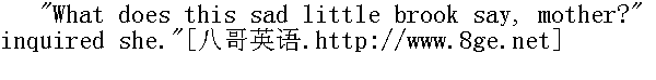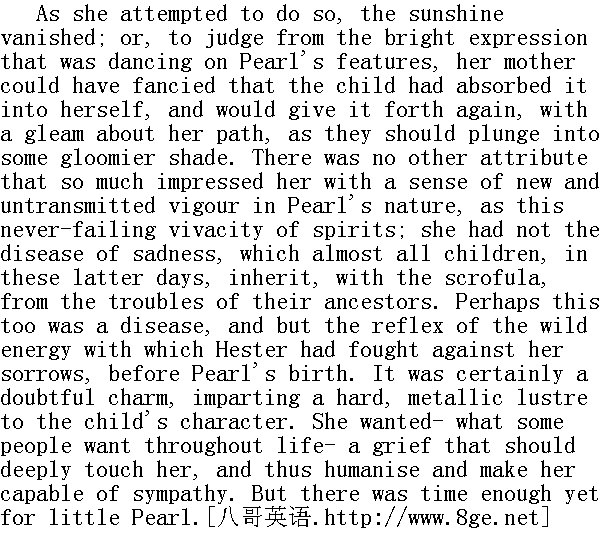 成,你可得全告诉我,"珠儿回答。 "Once in my life I met the Black Man!" said her mother. "This scarlet letter is his mark!"" 我活这么大就见过那黑男人一次!"她母亲说。"这个红字就是他的记号!" Thus conversing, they entered sufficiently deep into the wood to secure themselves from the observation of any casual passenger along the forest track. Here they sat down on a luxuriant heap of moss; which, at some epoch of the preceding century, had been a gigantic pine, with its roots and trunk in the darksome shade, and its head aloft in the upper atmosphere. It was a little dell where they had seated themselves, with a leaf-strewn bank rising gently on either side, and a brook flowing through the midst, over a bed of fallen and drowned leaves. The trees impending over it had flung down great branches, from time to time, which choked up the current, and compelled it to form eddies and black depths at some points; while, in its swifter and livelier passages, there appeared a channel-way of pebbles, and brown, sparkling sand. Letting the eyes follow along the course of the stream, they could catch the reflected light from its water, at some short distance within the forest, but soon lost all traces of it amid the bewilderment of tree-trunks and underbrush, and here and there a huge rock covered over with grey lichens. All these giant trees and boulders of granite seemed intent on making a mystery of the course of this small brook; fearing, perhaps, that, with its never-ceasing loquacity, it should whisper tales out of the heart of the old forest whence it flowed, or mirror its revelations on the smooth surface of a pool. Continually, indeed, as it stole onward, the streamlet kept up a babble, kind, quiet, soothing, but melancholy, like the voice of a young child that was spending its infancy without playfulness, and knew not how to be merry among sad acquaintance and events of sombre hue. 母女俩一边这么谈着,就走进了树林挺深的地方,在这儿她们很安全,绝不会被任何随便走过林中小径的路人看到。她们这时在一堆繁茂的青苔上坐了下来,这地方在一百多年以前,曾经长过一棵巨松,树冠高耸入云,树根和树干遮在浓荫之中。她们所坐的地方是一个小小的山谷,两侧的缓坡上铺满树叶,中间流着一条小溪,河底淹没着落时。悬在溪上的树木常年来投下的大树枝,阻逼了溪流,在一些地方形成了漩涡和深潭;而在溪水畅通、流得欢快的地段,则露出河底的石子和闪光的褐砂。她们放眼沿河道望去,可以看见在林中不远的地方水面粼粼的反光,但没多久,就在盘错的树干和灌木中失去了踪迹,而不时为一些长满灰色地衣的巨石遮住视线。所有这些大树和巨石似乎有意为这条小小的溪流蒙上一层神秘的色彩;或许是害怕它那喋喋不休的多嘴多舌会悄悄道出它所流经的古老树林的内心秘密,或者是害怕它那流过池塘时的光滑水面会映出其隐衷。确实,当小溪不停地偷偷向前流动时,一直在潺潺作响,那声音和蔼、平静又亲切,但总带点忧郁,就象一个婴儿时期没有玩痛快的小孩子,仍然不知如何在伤心的伙伴和阴暗的事件中自得其乐。 "O brook! O foolish and tiresome little brook!" cried Pearl, after listening awhile to its talk. "Why art thou so sad? Pluck up a spirit, and do not be all the time sighing and murmuring!"" 啊,小河啊!啊,蠢得烦人的小河啊!"珠儿聆听了一阵儿流水的谈话后这样叫着人"你为什么这样伤心?打起点精神来,别总是哀声叹气的!" But the brook, in the course of its little lifetime among the forest-trees, had gone through so solemn an experience that it could not help talking about it, and seemed to have nothing else to say. Pearl resembled the brook inasmuch as the current of her life gushed from a well-spring as mysterious, and had flowed through scenes shadowed as heavily with gloom. But, unlike the little stream, she danced and sparkled, and prattled airily along her course. 但在林间流过它短短生命的溪水,其经历是那样地肃穆,不可能不把它讲出来,而且看来也别无其它可说。珠儿与那溪水就有点相似,她的生命也是涌自一个神秘之泉,并流经同样阴沉的暗景。但同溪水不同的是,她是一路蹦蹦跳跳地走过来的,她容光焕发,谈吐轻快。