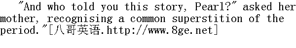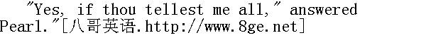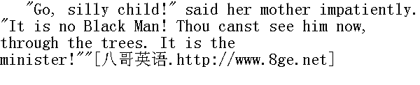 这条伤心的小河都说些什么啊;妈妈?"她询问道。 "If thou hadst a sorrow of thine own, the brook might tell thee of it," answered her mother, "even as it is telling me of mine! But now, Pearl, I hear a footstep along the path, and the noise of one putting aside the branches. I would have thee betake thyself to play, and leave me to speak with him that comes yonder."" 如果你有自己的忧伤,那么小溪也可以跟你把它说出来的,"她母亲回答,"就象它在对我谈我的忧伤一样!不过,珠儿,这会儿我听到有脚步声沿着小路走来,-还有拨开树枝的声音。我想让你自己去玩一会儿,留下我和走来的那人谈一谈。" "Is it the Black Man?" asked Pearl." 是那个黑男人吗?"珠儿问。 "Wilt thou go and play, child?" repeated her mother. "But do not stray far into the wood. And take heed that thou come at my first call."" 你去玩儿好吗,孩子?"她母亲又说了一遍。"可是别在林子里走得太远。留点心,我一叫你就回来。" "Yes, mother," answered Pearl. "But if it be the Black Man, wilt thou not let me stay a moment, and look at him, with his big book under his arm?"" 好的,妈妈,"珠儿回答说。"不过,要是那个黑男人,你就让我稍稍呆上一会儿,看上他一眼,他还挟着那本大册子呢,不是吗?"
