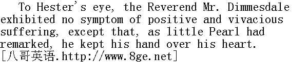 在海丝特的眼中,丁梅斯代尔牧师先生除去象小珠儿曾经说过的那样,总用手捂着心口之外,没有表现出显面易见的受折磨的征候。