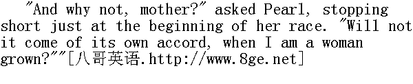 于嘛不戴呢,妈妈?"珠儿问道,她刚要拔腿朝前跑,忽地停下了脚步。"等我长成大人,难道它不会自然就来了吗?" "Run away, child," answered her mother, "and catch the sunshine!It will soon be gone."" 快跑吧,孩子,"她母亲回答,"去抓住阳光!它会转眼就跑掉的。" Pearl set forth, at a great pace, and, as Hester smiled to perceive, did actually catch the sunshine, and stood laughing in the midst of it, all brightened by its splendour, and scintillating with the vivacity excited by rapid motion. The light lingered about the lonely child, as if glad of such a playmate, until her mother had drawn almost nigh enough to step into the magic circle too. 珠儿拔腿飞快地跑去,海丝特微笑着看到,她还真的抓住了阳光,并且站在阳光中放声大笑,全身披着的灿烂的彩晖,还随着她快速移动的活跃激荡着而闪闪发亮。那光亮依傍在孤独的孩子身边,似是因为有了这样一个玩伴而兴高采烈,一直到她母亲差不多也要迈步进入那充满魔力的光圈为止。 "It will go now," said Pearl, shaking her head." 这下它要走了,"珠儿摇着头说。 "See!" answered Hester, smiling. "Now I can stretch out my hand, and grasp some of it."" 瞧!"海丝特微笑着回答。"现在我可以伸出手来,抓住一些阳光了。"