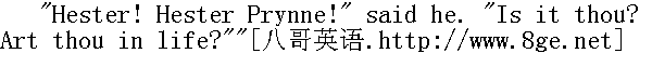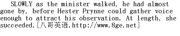 尽管牧师走得很慢,也几乎要走过去了,可海丝特·白兰还是提不起声音喊他。最后,她总算叫了出来。 "Arthur Dimmesdale!" she said, faintly at first; then louder, but hoarsely: "Arthur Dimmesdale!"" 阿瑟·丁梅斯代尔!"她说,起初有气无力,后来声音倒是放开了,可是有些沙哑。"阿瑟·丁梅斯代尔!" "Who speaks?" answered the minister." 是谁在说话?"牧师应声说。 Gathering himself quickly up, he stood more erect, like a man taken by surprise in a mood to which he was reluctant to have witnesses. Throwing his eyes anxiously in the direction of the voice, he indistinctly beheld a form under the trees, clad in garments so, sombre, and so little relieved from the grey twilight into which the clouded sky and the heavy foliage had darkened the noontide, that he knew not whether it were a woman or a shadow. It may be, that his pathway through life was haunted thus, by a spectre that had stolen out from among his thoughts. 他立刻提起精神,挺直身子站住了,就象是一个人正处于不想被人看见的心情之中,突然吃了一惊似的。他急切地循声望去,模模糊糊地看见树下有个人影,身上的服色十分晦暗,在阴霾的天空和浓密的树荫遮得连正午都极为膝脆的昏幽之中,简直难以分辨,'他根本说不上那儿是个女人还是个影子。也许,在他的人生旅途上,常有这么一个幽灵从他的思想里溜出来纠缠他吧。 He made a step nigher, and discovered the scarlet letter. 他向前迈了一步,发现了红字。