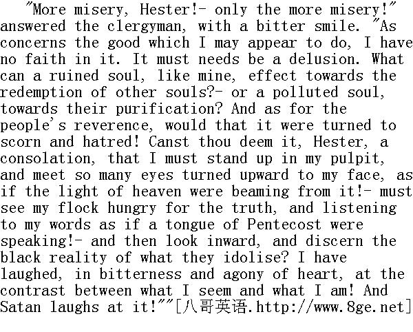 海丝特,"他说,"你得到平静了吗?" She smiled drearily, looking down upon her bosom. 她凄楚地笑了笑,垂下眼睛看着自己胸前。 "Hast thou?" she asked." 你呢?"她反问…… "None!- nothing but despair!" he answered. "What else could I look for, being what I am, and leading such a life as mine? Were I an atheist- a man devoid of conscience- a wretch with coarse and brutal instincts- I might have found peace, long ere now. Nay, I never should have lost it! But, as matters stand with my soul, whatever of good capacity there originally was in me, all of God's gifts that were the choicest have become the ministers of spiritual torment. Hester, I am most miserable."" 没有!--除了绝望再无其它!"他回答说。"作为我这样一个人,过着我这样的生活,我又能指望什么呢?如果我是一个无神论者,--一个丧尽良心的人,--一个本性粗野的恶棍,--或许我早就得到了平静。不,我本来就不该失去它的!不过,就我的灵魂而论,无论我身上原先有什么好品质,上帝所赐予的一切最精美的天赋已经全都变成了精神折磨的执行者。海丝特,我实在太痛苦了!" "The people reverence thee," said Hester. "And surely thou workest good among them! Doth this bring thee no comfort?"" 人们都尊重你,"海丝特说。"而且说实在的,你在他们中间确实做着好事!这一点难道还不能给你带来慰藉吗?"