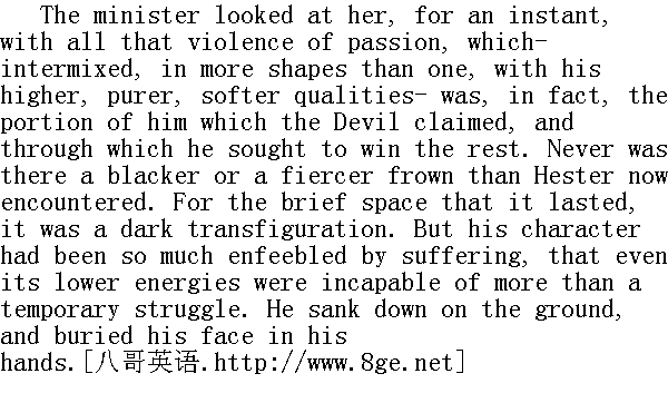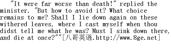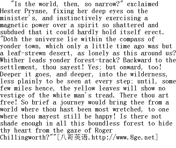 你说,这世界是这么狭小吗?"海丝特·白兰一边高声说着,一边用她那深沉的目光注视着牧师的眼睛,她的目光本能地有一种磁石般的效力,作用在那涣散消沉得简直无法撑持自己的精神之上。"难道整个天地就只在那边那小镇的范围之内吗?只在不久之前,那里还是一片撒满落时的荒野,和我们现在呆的这地方差不多凄凉。那林中小径是通往何处的呢?你会说,是返回居民区的!不错;但是还可以再往前走啊。它越往深处去,就更源源地通向蛮荒野地,每走一步,人们就会越看不清它,直到再走不多久,枯黄的落叶上便不见白人的足迹了。到那里,你就自由了!只消走这短短的一程路,就可以把你从使你万分苦恼的世界带到你仍可享受到幸福的地方!在这无边无际的大森林里难道还没有一处树荫足以将你的心隐藏起来,不让罗杰·齐灵渥斯监视吗?" "Yes, Hester; but only under the fallen leaves!" replied the minister, with a sad smile." 是有的,海丝特;不过只是在这些落叶之下!"牧师苦笑着回答说。 "Then there is the broad pathway of the sea!" continued Hester. "It brought thee hither. If thou so choose, it will bear thee back again. In our native land, whether in some remote rural village or in vast London- or, surely, in Germany, in France, in pleasant Italy- thou wouldst be beyond his power and knowledge! And what hast thou to do with all these iron men, and their opinions? They have kept thy better part in bondage too long already!" " 何况还有海上的宽阔航道!"海丝特继续说。"是它把你带到了这里。只要你愿意,它还可以把你再送回去。在我们的祖国,不管是在偏僻的农村,还是在大城市伦敦--或者,当然还有德国、法国、以及令人愉快的意大利,--你都会超出他努力所及并且不为他所知晓!到那时,你与这些铁石心肠的人们,还有他们的看法,又有什么关系呢?他们已经尽其所能把你禁锢这么久了!" "It cannot be!" answered the minister, listening as if he were called upon to realise a dream. "I am powerless to go! Wretched and sinful as I am, I have had no other thought than to drag on my earthly existence in the sphere where Providence hath placed me. Lost as my own soul is, I would still do what I may for other human souls! I dare not quit my post, though an unfaithful sentinel, whose sure reward is death and dishonour, when his dreary watch shall come to an end!"" 那可不成!"牧师回答,听他那口气,就象是要他去实现一场梦。"我根本没力气去。象我这样一个悲惨的罪人,只有-个念头,就是在上天已经安排给我的地域里了此残生。既然我已经失去了自己的灵魂,我只有继续尽我所能来拯救别的灵魂!虽说我是个不忠于职守的哨兵,等到这种沉网的守望终了的时候,我所能得到的报酬只能是不光彩的死亡,但我仍不敢擅离岗位!" "Thou art crushed under this seven years' weight of misery," replied Hester, fervently resolved to buoy him up with her own energy. "But thou shalt leave it all behind thee! It shall not cumber thy steps, as thou treadest along the forest-path; neither shalt thou freight the ship with it, if thou prefer to cross the sea. Leave this wreck and ruin here where it hath happened. Meddle no more with it! Begin all anew! Hast thou exhausted possibility in the failure of this one trial? Not so! The future is yet full of trial and success. There is happiness to be enjoyed! There is good to be done! Exchange this false life of thine for a true one. Be, if thy spirit summon thee to such a mission, the teacher and apostle of the red men. Or- as is more thy nature- be a scholar and a sage among the wisest and the most renowned of the cultivated world. Preach! Write! Act! Do anything, save to lie down and die! Give up this name of Arthur Dimmesdale, and make thyself another, and a high one, such as thou canst wear without fear or shame. Why wouldst thou tarry so much as one other day in the torments that have so gnawed into thy life!- that have made thee feeble to will and to do!- that will leave thee powerless even to repent! Up, and away!"" 你已经给这长达七年的不幸的重荷压垮了,"海丝特应着,热心地用自己的精力给他鼓劲。"但是你应该把这一切都抛在身后!当你沿着林中小径走去时,你不该让它拖累你的脚步,如果你想跨海东归,你也不该把它带到船上。把你遭受到的一切损害都留在发生地吧。不要再去理睬它!一切从新开始!这次尝试失败了,你就不可能再干了吗?不是这样的!未来还是充满尝试和成功的。还有幸福有待你去享有!还有好事要你去做!把你的虚伪的生活变成真实的生活吧。如果你的精神召唤你去从事这一使命,就到红种印第安人中间去作牧师和使徒吧。或者,--也许更符合你的秉性--在有教养的世界的那些最聪明和最著名的人们中间去作一名学者和圣哲吧。你可以去布道!去写作!去有一番作为!你可以做任何事情,只要不躺下死掉!放弃阿瑟·丁梅斯代尔这个姓名,给你自己另起一个,换一个更高贵的,好使你在那姓名下不会感到恐惧和耻辱。你何必还要一天天陷在蚕食着你生命的痛苦之中!--它已经削弱了你的意志和行动!--它已经折磨得你甚至无力去悔改了!挺身起来,离开这里吧!"