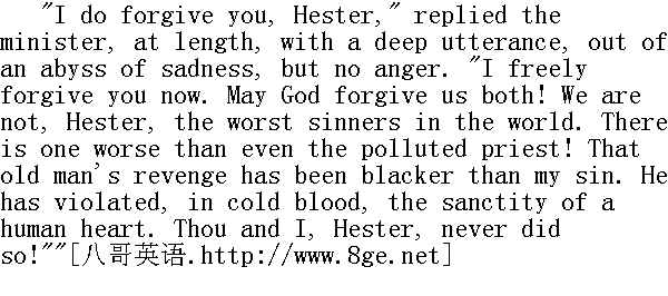 我一定原谅你,海丝特,"牧师终于回答了,同时深深地叹了一口气,那是发自悲伤而不是气愤的深渊的。"我现在爽快地原谅你。愿上帝饶恕我们俩吧!海丝特,我们并不是世上最坏的罪人。还有一个人,甚至比受到玷污的教士还要坏!那老人的复仇比我的罪过更见不得人。他阴险地凌辱一颗神圣不可侵犯的心灵。你和我,海丝特,从来没干过这种事!" "Never, never!" whispered she. "What we did had a consecration of its own. We felt it so! We said so to each other! Hast thou forgotten it?"" 从来没有,从来没有!"她悄声说。"我们的所作所为其本身是一种神圣的贡献。我们是这样看的!我们在一起说过的!你忘了吗?" "Hush, Hester!" said Arthur Dimmesdale, rising from the ground. "No; I have not forgotten!"" 嘘,海丝特!"阿瑟·丁梅斯代尔说着,从地上站起身来。 "没有;我没忘!"' They sat down again, side by side, and hand clasped in hand, on the mossy trunk of the fallen tree. Life had never brought them a gloomier hour; it was the point whither their pathway had so long been tending, and darkening ever, as it stole along; and yet it enclosed a charm that made them linger upon it, and claim another, and another, and, after all, another moment. The forest was obscure around them, and creaked with a blast that was passing through it. The boughs were tossing heavily above their heads; while one solemn old tree groaned dolefully to another, as if telling the sad story of the pair that sat beneath, or constrained to forbode evil to come. 他俩重新坐下;肩并着肩,手握着手,就这样坐在长满青苔的倒下的树干上。这是生命赋予他们的最阴郁的时刻;这是生命旅途早就引导他们走来的地方,而且在他们的不知不觉之中越走越黑暗;然而此时此地却包含着一种魅力,叫他们留连忘返,期望着能够再停留一会儿,再停留一会儿,终归仍是再停留一会儿。四下的森林朦胧一片,一阵风吹过,响起噼啪之声。粗大的树枝在他们的头上沉重地摇晃;一棵肃穆的老树对另一棵树悲声低吟,仿佛在倾诉树下坐着的这一对人儿的伤心的故事,或是在不得不预告那行将到来的邪恶。 And yet they lingered. How dreary looked the forest-track that led backward to the settlement, where Hester Prynne must take up again the burden of her ignominy, and the minister the hollow mockery of his good name! So they lingered an instant longer. No golden light had ever been so precious as the gloom of this dark forest. Here, seen only by his eyes, the scarlet letter need not burn into the bosom of the fallen woman! Here, seen only by her eyes, Arthur Dimmesdale, false to God and man, might be for one moment true! 然而他们仍然不肯回去。那通往居民区的林中小路看来有多么沉闷,一回到那居民区,海丝特·白兰就得重新负起她那耻辱的重荷,而牧师则要再次戴上他那好名声的空虚的面具!因此他们就又多呆了一会儿。金色的光辉从来没有象在这黑树林的幽暗中这么可贵。在这里,红字只有他一个人的眼睛能够看见,也就不必烧进那堕落的女人的胸膛中去了!在这里,对上帝和人类都虚伪的阿瑟·丁梅斯代尔也只有她一人的眼睛能够看见,也就在这片刻之间变得诚实了!