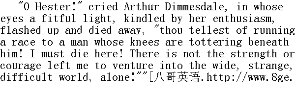 噢,海丝特!"阿瑟·丁梅斯代尔喊道,她的热情在他的眼中燃起一道闪光,亮了一下就又熄灭了,"你是在鼓励一个两膝发抖的人去赛跑!我身上已经没有力量和勇气独自到那广袤、陌生和困难的天地去闯荡了!" It was the last expression of the despondency of a broken spirit. He lacked energy to grasp the better fortune that seemed within his reach. 这是一颗破碎的心完全沮丧的最后表示。他没有力气去抓住那似是唾手可得的幸运。 He repeated the word. 他又重复了一遍那个字眼。 "Alone, Hester!"" 独自一人啊,海丝特!" "Thou shalt not go alone!" answered she, in a deep whisper." 不会叫你独自一人前往的!"她深沉地悄声回答说。