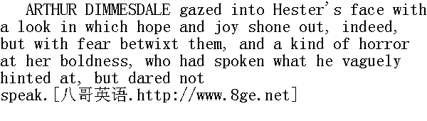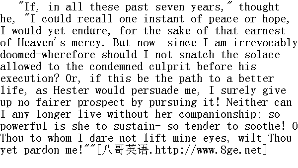 阿瑟·丁梅斯代尔凝视着海丝特的面孔,他的神情中确实闪烁着希望和欣喜,但其中也夹杂着畏缩,以及对她的胆识的一种惊惧,因为她说出了他隐约地暗示而没敢说出的话。 But Hester Prynne, with a mind of native courage and activity, and for so long a period not merely estranged, but outlawed, from society, had habituated herself to such latitude of speculation as was altogether foreign to the clergyman. She had wandered, without rule or guidance, in a moral wilderness; as vast, as intricate and shadowy, as the untamed forest, amid the gloom of which they were now holding a colloquy that was to decide their fate. Her intellect and heart had their home, as it were, in desert places, where she roamed as freely as the wild Indian in his woods. For years past she had looked from this estranged point of view at human institutions, and whatever priests or legislators had established; criticising all with hardly more reverence than the Indian would feel for the clerical band, the judicial robe, the pillory, the gallows, the fireside, or the church. The tendency of her fate and fortunes had been to set her free. The scarlet letter was her passport into regions where other women dared not tread. Shame, Despair, Solitude! These had been her teachers- stern and wild ones- and they had made her strong, but taught her much amiss. 但是,海丝特·白兰天生具有勇敢和活跃的气质,加之这多年来不仅被人视如陌窖,而且为社会所摒弃,所以就形成了那样一种思考问题的高度,对牧师来说简直难以企及。她一直漫无目标地在道德的荒野中徘徊;那荒野同这荒林一样广漠、一样错综、一样阴森,而他俩如今正在这幽暗的林中进行决定他们命运的会谈。她的智慧和心灵在这里适得其所,她在荒漠之处自由漫游,正如野蛮的印第安人以林为家。在过去这些年中,她以陌生人的目光看待人类的风俗制度,以及由教士和立法者所建立的一切;她几乎和印第安人一样,以不屑的态度批评牧师的丝带、法官的黑袍、颈手枷、绞刑架、家庭或教会。她的命运发展的趋向始终是放纵她自由的。红字则是她进入其他妇女不敢涉足的禁区的通行证。耻辱,绝望,孤寂!--这些就是她的教师,而且是一些严格粗野的教师,他们既使她坚强,也教会她出岔于。 The minister, on the other hand, had never gone through an experience calculated to lead him beyond the scope of generally received laws; although, in a single instance, he had so fearfully transgressed one of the most sacred of them. But this had been a sin of passion, not of principle, nor even purpose. Since that wretched epoch, he had watched, with morbid zeal and minuteness, not his acts- for those it was easy to arrange- but each breath of emotion, and his every thought. At the head of the social system, as the clergyman of that day stood, he was only the more trammelled by its regulations, its principles, and even its prejudices. As a priest, the framework of his order inevitably hemmed him in. As a man who had once sinned, but who kept his conscience all alive and painfully sensitive by the fretting of an unhealed wound, he might have been supposed safer within the line of virtue than if he had never sinned at all. 而在牧师那一方面,却从来没有过一种经历会引导他跨越雷池一步;虽说只有一例,他曾经那么可怕地冒犯了其中最为神圣的戒条。但那只是情感冲动造成的罪过,并非原则上的对抗,甚至不是故意而为。从那倒霉的时日起,他一直以病态的热情,小心翼翼地监视着自己的,不是他的行为--因为这很容易调整--,而是他的每一丝情绪和每一个念头。当年,牧师们是身居社会首位的,因此他只能更受戒律、原则甚至偏见的束缚。身为牧师,他的等级观必然也会限制他。作为一个一度犯罪、但又因未愈的伤口的不断刺激而良心未泯并备受折磨的人,他或许会认为比起他从未有过罪孽反倒在道德上更加保险。 Thus, we seem to see that, as regarded Hester Prynne, the whole seven years of outlaw and ignominy had been little other than a preparation for this very hour. But Arthur Dimmesdale! Were such a man once more to fall, what plea could be urged in extenuation of his crime? None; unless it avail him somewhat, that he was broken down by long and exquisite suffering; that his mind was darkened and confused by the very remorse which harrowed it; that, between fleeing as an avowed criminal, and remaining as a hypocrite, conscience might find it hard to strike the balance; that it was human to avoid the peril of death and infamy, and the inscrutable machinations of an enemy; that, finally, to this poor pilgrim, on his dreary and desert path, faint, sick, miserable, there appeared a glimpse of human affection and sympathy, a new life, and a true one, in exchange for the heavy doom which he was now expiating. And be the stern and sad truth spoken, that the breach which guilt has once made into the human soul is never, in this mortal state, repaired. It may be watched and guarded; so that the enemy shall not force his way again into the citadel, and might even, in his subsequent assaults, select some other avenue, in preference to that where he had formerly succeeded. But there is still the ruined wall, and, near it, the stealthy tread of the foe that would win over again his unforgotten triumph. 这样,我们似乎就明白了:就海丝特·白兰而论,这备受摒弃和耻辱的整整七年的时间,只不过是为此时此刻做好准备而已。但阿瑟·丁梅斯代尔可不同!倘使象他这样一个人再次堕落的话,还能为减轻罪行作何辩白呢?没有了;除非可以勉强说什么:他被长期的剧烈痛苦压垮了;他的头脑已经被自责折磨得阴暗和混乱了;他要么承认是一名罪犯而逃走,要么
