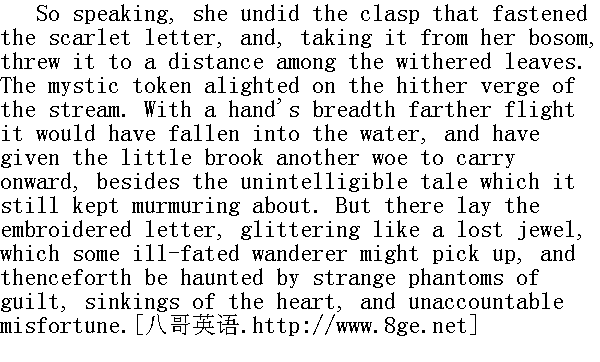 她一边这样说着,一边解开别着红字的胸针,从胸前取下红字,远远地抛到枯叶之中。那神秘的标志落在离小溪不远的地方。只消再飞这几指宽的距离,红字就会落进水里,那样的话,小溪除去连续不断地喃喃诉说着的莫测的故事之外,又要载着另一段哀怨流淌了。但那个刺绣的红字落在岸边,象一颗遗失的珠宝似的闪闪发光,某个倒霉的流浪者可能会把它拣起来,从此便会被神秘的罪恶幽灵、沉沦的心灵和难言的不幸所萦绕了。 The stigma gone, Hester heaved a long, deep sigh, in which the burden of shame and anguish departed from her spirit. Oh, exquisite relief! She had not known the weight, until she felt the freedom! By another impulse, she took off the formal cap that confined her hair; and down it fell upon her shoulders, dark and rich, with at once a shadow and a light in its abundance, and imparting the charm of softness to her features. There played around her mouth, and beamed out of her eyes, a radiant and tender smile, that seemed gushing from the very heart of womanhood. A crimson flush was glowing on her cheek, that had been long so pale. Her sex, her youth, and the whole richness of the beauty, came back from what men call the irrevocable past, and clustered themselves, with her maiden hope, and a happiness before unknown, within the magic circle of this hour. And, as if the gloom of the earth and sky had been but the effluence of these two mortal hearts, it vanished with their sorrow. All at once, as with a sudden smile of heaven, forth burst the sunshine, pouring a very flood into the obscure forest, gladdening each green leaf, transmuting the yellow fallen ones to gold, and gleaming adown the grey trunks of the solemn trees. The objects that had made a shadow hitherto, embodied the brightness now. The course of the little brook might be traced by its merry gleam afar into the wood's heart of mystery, which had become a mystery of joy. 海丝特除掉那耻辱的标志之后,深深长叹一声,她的精神就此解脱了耻辱和苦闷的重荷,轻松得简直飘然欲仙了!她如今感到了自由,才明白那重荷的份量!随着另一次冲动,她摘下了那顶束发的正正经经的帽子;满头乌黑浓密的秀发立刻飘洒在肩头,厚实之中显出光影婆婆,为她的容貌乎添了柔和之美。她的嘴角和眼波中散发出温柔的嫣然笑意,似是涌自她女性的心头。长期以来十分苍白的面颊也泛起红潮。她的女性,她的青春,和她各方面的美,都从所谓的无可挽回的过去中恢复了,伴随而来的是她少女时期的希望和一种前所不知的幸福,都在此时此刻的魔圈中荟萃一堂。而且,那种天昏地暗似乎是这两个人心中流泄出来的,此时也随着他们忧伤的消逝而消散了。突然之间,天空似乎一下子绽出微笑,立时阳光四射,将灿烂的光芒洒向膝腕的树林,使每一片绿叶都兴高采烈,把所有枯黄的落时染成金黄,连肃穆的树木的灰色树干也闪出亮光。原先造成阴影的东西,如今也成了发光体。小溪的河道也愉快地粼粼闪光,溯源而上可以直抵树林的那神秘心脏。此时也已成为一种欢乐的神秘。 Such was the sympathy of Nature- that wild, heathen Nature of the forest, never subjugated by human law, nor illumined by higher truth- with the bliss of these two spirits! Love, whether newly born, or aroused from a death-like slumber, must always create a sunshine, filling the heart so full of radiance, that it overflows upon the outward world. Had the forest still kept its gloom, it would have been bright in Hester's eyes, and bright in Arthur Dimmesdale's! 这就是大自然--从未被人类法律管制过的、也从未被更高的真理照射过的蛮荒的、异端的、森林中的大自然--对这两个人精神的祝福所表示的同情!无论是新诞生的、抑或是从昏死般沉睡中醒来的爱情,总要产生一种阳光,将内心充满,并洋溢而出,喷薄到外界。此时即使林中仍然幽暗如故,在海丝特的眼中,在阿瑟。丁梅斯代尔的眼中,也仍然会是光芒四射的! Hester looked at him with the thrill of another joy. 海丝特望着他,心头又是一阵喜悦的震颤。 "Thou must know Pearl!" said she. "Our little Pearl! Thou hast seen her- yes, I know it!- but thou wilt see her now with other eyes. She is a strange child! I hardly comprehend her! But thou wilt love her dearly, as I do, and wilt advise me how to deal with her."" 你应该认识一下珠儿!"她说。"我们的小珠儿!你已经见过她了,--是啊,我知道的!--但现在你要用另一副目光来见她。她是一个怪孩子!我简直不理解她!但你会象我一样亲亲热热地爱她,还要给我出出主意怎么对付她。"