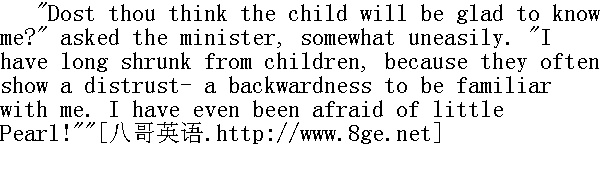 而她在这林中,也要比在居民区两边铺了草的街道上,或是她母亲的茅屋中,显得温和些。花朵象是明白这一点;在她经过时,就会有那么一两朵悄声低语:"用我来打扮打扮你自己吧,你这漂亮的孩子,用我来打扮打扮你自己吧!"--而为了让它们高兴,珠儿也就摘了几朵紫罗兰、银莲花和耧斗菜,以及一些从老树上垂到她眼前的翠绿的嫩枝。她用这些花枝编成花环,戴往头发上,缠在腰肢间,于是便成了一个小仙子,或是林中小仙女,或是同古老的树林最为亲密无间的什么精灵。珠儿把自己这样打扮好了,便听到她母亲的呼唤,慢慢地往回走去。 Slowly; for she saw the clergyman! 她走得很慢,因为她看到了牧师。