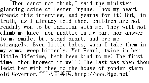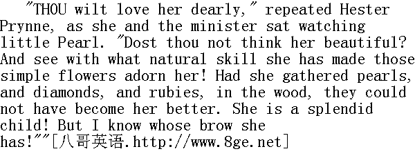 你会十分喜爱她的,"海丝特·白兰又说了下遍,这时她和牧师正坐在那里瞅着小珠儿。"你难道不认为她很美吗?你看,她天生有多大的本事用那些普通的花朵来装扮自己啊!就算她能在林中采到珍珠、钻石和红宝石,也不会把自己打扮得比这更漂亮了。她是一个十分出色的孩子!但我知道她的额头长得象谁!" "Dost thou know, Hester," said Arthur Dimmesdale, with an unquiet smile, "that this dear child, tripping about always at thy side, hath caused me many an alarm? Methought- O Hester, what a thought is that, and how terrible to dread it!- that my own features were partly repeated in her face, and so strikingly that the world might see them! But she is mostly thine!"" 你知道,海丝特,"阿瑟·丁梅斯代尔带着不安的微笑说, "这个总是在你身边蹦蹦跳跳的可爱的孩子,曾经多次引起我心惊肉跳吗?我认为,--噢,海丝特,这是个什么样的念头,而且产生这种顾虑又是多么可怕啊!--我自己的一部分面容重现在她的脸上,而且那么酷似,我真怕人们会认出来!不过,她主要还是象你!" "No, no! Not mostly!" answered the mother, with a tender smile. "A little longer and thou needest not be afraid to trace whose child she is. But how strangely beautiful she looks, with those wild flowers in her hair! It is as if one of the fairies, whom we left in our dear old England, had decked her out to meet us."" 不,不!不是主要象我!"做母亲的露出温柔的微笑回答说。"过不多久,你就不必担心人们会追究她是谁的孩子了。她头发上戴着那些野花,显得她的模样漂亮得多么不平常啊!仿佛有一个被我们留在我们亲爱的老英格兰的仙子,把自己打扮好,跑来迎接我们了。" It was with a feeling which neither of them had ever before experienced, that they sat and watched Pearl's slow advance. In her was visible the tie that united them. She had been offered to the world, these seven years past, as the living hieroglyphic, in which was revealed the secret they so darkly sought to hide- all written in this symbol- all plainly manifest- had there been a prophet or magician skilled to read the character of flame! And Pearl was the oneness of their being. Be the foregone evil what it might, how could they doubt that their earthly lives and future destinies were conjoined, when they beheld at once the material union, and the spiritual idea, in whom they met, and were to dwell immortally together? Thoughts like these- and perhaps other thoughts, which they did not acknowledge or define- threw an awe about the child, as she came onward. 他俩坐在那里,正是怀着一种他们谁也没有体验过的感情来注视着珠儿慢慢走来。在她身上能够看出把他俩连系在一起的纽带。过去这七年里,她作为如同有生命的象形文字,被奉献给人类社会,在她身上揭示了他们竭力要隐藏的秘密,要是有一位先知或法师有本领破解这个火焰般的文字的话,就会懂得一切全都写在这个象征之中,一切全都显示得明明白自!而珠儿就是他俩生命的合而为一。不管以往的邪恶可能是什么,当他们一起看到,由他们交汇并将永在一起共存的肉体结晶和精神概念时,他们怎么可能会怀疑,他们在凡世的生命和未来的命运已经密不可分呢?象这样的想法,以及其它一些他们没有承认或尚未定形的可能的想法,当那孩子向前走着的时候,在她身上投射出一种使人敬畏的色彩。 "Let her see nothing strange- no passion nor eagerness- in thy way of accosting her," whispered Hester. "Our Pearl is a fitful and fantastic little elf, sometimes. Especially, she is seldom tolerant of emotion, when she does not fully comprehend the why and wherefore. But the child hath strong affections! She loves me, and will love thee!"" 你跟她搭话的时候,别让她看出什么不同寻常的地方,既不要太热情,也不要太急切,"海丝特轻声说。"我们的珠儿有时候是个一阵阵让人捉摸不定的小精灵。尤其是在她不大明白缘由的时候,很难接受别人的激情。不过,这孩子有着强烈的爱!她爱我,而且也会爱你的!"