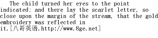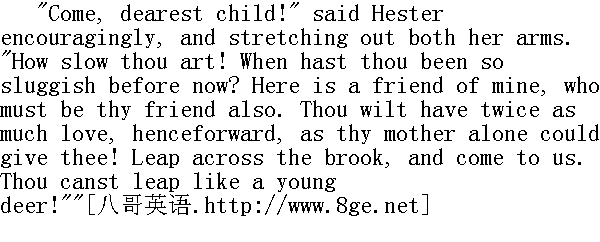过来,乖宝贝儿!"海丝特给孩子鼓劲说,同时伸出了双臂。 "你走得太慢慢腾腾了!你什么时候象现在这样懒洋洋过?这儿有我的一个朋友,他也该是你的朋友。从今以后,你就不只有你妈妈一个人的爱了,你要得到双倍的爱的!跳过小溪,到我们这儿来。你不是可以象一头小鹿一样地跳嘛!" Pearl, without responding in any manner to these honey-sweet expressions, remained on the other side of the brook. Now she fixed her bright, wild eyes on her mother, now on the minister, and now included them both in the same glance; as if to detect and explain to herself the relation which they bore to one another. For some unaccountable reason, as Arthur Dimmesdale felt the child's eyes upon himself, his hand- with that gesture so habitual as to have become involuntary- stole over his heart. At length, assuming a singular air of authority, Pearl stretched out her hand, with the small forefinger extended, and pointing evidently towards her mother's breast. And beneath, in the mirror of the brook, there was the flower-girdled and sunny image of little Pearl, pointing her small forefinger too. 珠儿对这些甜蜜的话语不理不睬,仍然呆在小溪的对岸。此时她那一对明亮而狂野的脖子,时而盯着她母亲,时而盯着牧师,时而同时盯住他们两个;仿佛耍想弄清并给自己解释他们两人之间的关系。出于某种难以名状的原因,阿瑟·丁梅斯代尔感到孩子助目光落在他身上时,他的手以习惯成自然的姿势,悄悄捂到了心口上。最后,珠儿作出一副独特的不容置辩的神情,伸出她小小的食指,显然是指着她母亲的胸部。在她脚下,映在镜面般的溪水中的那个戴着花环、浴满阳光的小珠儿的影象,也指点着她的小小的食指。 "Thou strange child, why dost thou not come to me?" exclaimed Hester." 你这个怪孩子,为什么不到我身边来呢?"海丝特叫道。 Pearl still pointed with her forefinger; and a frown gathered on her brow; the more impressive from the childish, the almost baby-like aspect of the features that conveyed it. As her mother still kept beckoning to her, and arraying her face in a holiday suit of unaccustomed smiles, the child stamped her foot with a yet more imperious look and gesture. In the brook, again, was the fantastic beauty of the image, with its reflected frown, its pointed finger, and imperious gesture, giving emphasis to the aspect of little Pearl. 珠儿依旧用她的食指指点着;眉间渐渐皱起;由于这姿态表情来自一个满脸稚气、甚至象婴儿般面孔的孩子,就给人印象尤深。而由于她母亲仍在不断呼唤她,而且脸上堆满非比寻常的笑容,那孩子便以更加专横的神情和姿态使劲跺着两脚。同样,在小溪中那个美得出奇的形象,也映出了皱着的眉头、伸出的手指和专横的姿态,为小珠儿的模样平添了效果。 "Hasten, Pearl; or I shall be angry with thee!" cried Hester Prynne, who, however inured to such behaviour on the elf-child's part at other seasons, was naturally anxious for a more seemly deportment now. "Leap across the brook, naughty child, and run hither! Else I must come to thee!"" 快点,珠儿;要不我可要跟你生气了!"海丝特·白兰嚷道,她平时尽管已经熟习了这小精灵似的孩子的这种举止,但此时自然巴不得她能表现得更懂规矩些。"跳过小溪来,顽皮的孩子,跑过来!要不我就过去了!"