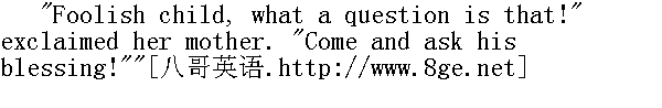 这一阴郁的变化完成之后,她向珠儿伸出了手。 "Dost thou know thy mother now, child?" asked she reproachfully, but with a subdued tone. "Wilt thou come across the brook, and own thy mother, now that she has her shame upon her- now that she is sad?"" 现在你认识你妈妈了吧,孩子?"她压着声音责问说。"现在你妈妈又戴上了她的耻辱,--她又悲伤了,你愿意走过河来,认她了吧?" "Yes; now I will!" answered the child, bounding across the brook, and clasping Hester in her arms. "Now thou art my mother indeed! And I am thy little Pearl!"" 是啊;现在我愿意过去了!"孩子回答着,跳过小溪,抱住了海丝特。"现在你才真是我妈妈了!而我也是你的小珠儿了! In a mood of tenderness that was not usual with her, she drew down her mother's head, and kissed her brow and both her cheeks. But then- by a kind of necessity that always impelled this child to alloy whatever comfort she might chance to give with a throb of anguish- Pearl put up her mouth, and kissed the scarlet letter too!" " 珠儿以一种她不常有的温柔劲,往下拽着她母亲的头,亲了她母亲的额头和双颊。可是,似乎有一种必要推动着这孩子,在她偶然给人的某种安慰中溶进一阵极度的苦恼,接着,珠儿抬起她的嘴唇,也把那红字亲吻了一下。 "That was not kind!" said Hester. "When thou hast shown me a little love, thou mockest me!" 这可不好!"海丝特说。"你对我表示出一点点爱的时候,却要嘲弄我!"