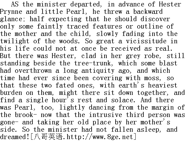 牧师先回去了。他一面在前面走着,一面回过头来望着海丝特·白兰和小珠儿,怀着几分期望,想透过林中暮霭,再看看逐渐模糊的母女二人的身影或面容。他的生活中发生了如此巨大的变迁,他一时还无法相信是真的。但是海丝特就在那儿,身穿灰袍,仍然站在树干的旁边--那是多年前被一阵疾风吹例的,之后年深日久就长满了青蔷,于是他们这两个承受着世上最沉重的负担的同命运的人,才得以一起坐在上面,安享那难得的一小时的休憩与慰藉。那儿还有珠儿,又轻捷地从溪边蹦跳着回到了母亲身边她的老位置,因为那闯来的第三者已经离去了。这么看来,牧师刚才并没有昏昏睡去,并非在梦中才见到这一切的! In order to free his mind from this indistinctness and duplicity of impression, which vexed it with a strange disquietude, he recalled and more thoroughly defined the plans which Hester and himself had sketched for their departure. It had been determined between them, that the Old World, with its crowds and cities, offered them a more eligible shelter and concealment than the wilds of New England, or all America, with its alternatives of an Indian wigwam, or the few settlements of Europeans, scattered thinly along the seaboard. Not to speak of the clergyman's health, so inadequate to sustain the hardships of a forest life, his native gifts, his culture, and his entire development, would secure him a home only in the midst of civilisation and refinement; the higher the state, the more delicately adapted to it the man. In furtherance of this choice, it so happened that a ship lay in the harbour; one of those questionable cruisers, frequent at that day, which, without being absolutely outlaws of the deep, yet roamed over its surface with a remarkable irresponsibility of character. This vessel had recently arrived from the Spanish Main, and, within three days' time, would sail for Bristol. Hester Prynne- whose vocation, as a self-enlisted Sister of Charity, had brought her acquainted with the captain and crew- could take upon herself to secure the passage of two individuals and a child, with all the secrecy which circumstances rendered more than desirable. 为了摆脱那搅得他莫名其妙地心烦意乱的说不清、道不明的印象,他回忆并更加彻底地澄清了一下他和海丝特为出走所安排的计划。他俩已经商妥,比起只在沿海一带疏落地散布着印第安人的茅屋或欧洲移民聚居区的新英格兰或全美洲的荒野,旧大陆人烟稠密、城市辏集,更适合于他们隐蔽或隐居式的生活。不消说,牧师的健康状况极不宜于忍受森林中的艰苦条件,何况他的天赋才能、他的文化教养以及他的全部前程,也只有在文明和优雅的环境中才能找到归宿;地位越高,他才越有用武之地。促使他们作出这一抉择的,还因为刚好有一条船停在港湾;这是那年月中时常有的一种形迹可疑的航船,虽说在深海中并非绝对地非法,却是带有极不负责任的性质在海面上游荡的。这艘船最近从拉丁美洲北部海域开来,准备在三天之内驶往英国的布利斯托尔。海丝特·白兰作为妇女慈善会的志愿人员,有机会结识了船长和海员,她可以有把握为两个大人和一个孩子弄到舱位,而且那种环境还提供了求之不得的一切保密要求。 The minister had inquired of Hester, with no little interest, the precise time at which the vessel might be expected to depart. It would probably be on the fourth day from the present. "That is most fortunate!" he had then said to himself. Now, why the Reverend Mr. Dimmesdale considered it so very fortunate, we hesitate to reveal. Nevertheless- to hold nothing back from the reader- it was because, on the third day from the present, he was to preach the Election Sermon; and, as such an occasion formed an honourable epoch in the life of a New England clergyman, he could not have chanced upon a more suitable mode and time of terminating his professional career. "At least, they shall say of me," thought this exemplary man, "that I leave no public duty unperformed, nor ill performed!" Sad, indeed, that an introspection so profound and acute as this poor minister's should be so miserably deceived! We have had, and may still have, worse things to tell of him; but none, we apprehend, so pitiably weak; no evidence, at once so slight and irrefragable, of a subtle disease, that had long since begun to eat into the real substance of his character. No man, for any considerable period, can wear one face to himself and another to the multitude, without finally getting bewildered as to which may be the true. 牧师曾经兴致勃勃地向海丝特询问了那艘船可能启航的准确时间。大概是从那天算起的第四天。"那可太幸运了!"他当时曾经这样自言自语。那么,为什么丁梅斯代尔牧师先生认为狠幸运呢?我们本不大想公之于众;然而,为了对读者无所隐瞒,我们不妨说说,因为在第三天,他要在庆祝选举的布道会上宣教;由于这样一个机缘构成了新英格兰牧师一生中的荣誉时期,因此也就成了他结束他的牧师生涯的难得的最恰当的方式和时机。"至少,他们在谈起我时,"这位为人楷模的人自忖,"会认为裁并非未尽公职或草草了事!"象这位可怜的牧师如此深刻和一丝不苟的自省,居然会遭到被人欺骗的悲惨下场,委实令人伤心!我们已经说过、也许还会说到他这个人的过失;但就我们所知,没有一件比这更软弱得可怜的了;眼下也没有任何证据比这更微不足道却无可辩驳地说明:一种微妙的疾病早巳开始蚕食他性格的实体了。在相当长的时期内,谁也无法对自己装扮出一副面孔,而对众人又装扮出另一副面孔,其结果必然是连他本人都会弄不清到底哪一副是真实