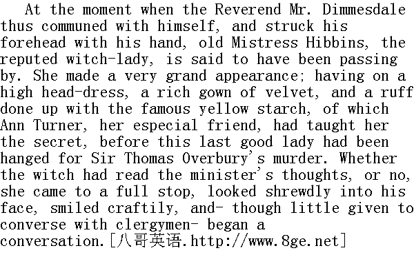 就在丁梅斯代尔牧师先生这样一边自言自语,一边用手拍着前额的时候,据说那有名的妖婆西宾斯老太太正好走过。她神气十足地头戴高帽,身穿富丽的丝绒长袍,颈上围着用著名的黄浆浆得笔挺的皱领,那种黄浆是按她的挚友安·特纳因谋杀托马斯·奥绍白利爵士而被绞之前教给她的秘方配制的。不管那妖婆是否看出了牧师的想法,反正她一下子停住了脚步,机灵地盯着他的面孔,狡诘地微笑着,并且开始同她从不打交道的牧师攀谈了起来。 "So, reverend sir, you have made a visit into the forest," observed the witch-lady, nodding her high head-dress at him. "The next time, I pray you to allow me only a fair warning, and I shall be proud to bear you company. Without taking overmuch upon myself, my good word will go far towards gaining any strange gentleman a fair reception from yonder potentate you wot of!"" 可敬的牧师先生,原来你去拜访了树林,"妖婆对他点点戴着高帽的头,开口说。"下一次,请你务必跟我打个招呼,我将十分自豪地陪你前往。不是我自吹,只消我说上一句好话,你知道的那位有权势的人,准会热情接待任何生客的!" "I profess, madam," answered the clergyman, with a grave obeisance, such as the lady's rank demanded, and his own good-breeding made imperative- "I profess, on my conscience and character, that I am utterly bewildered as touching the purport of your words! I went not into the forest to seek a potentate; neither do I, at any future time, design a visit thither, with a view to gaining the favour of such personage. My one sufficient object was to greet that pious friend of mine, the Apostle Eliot, and rejoice with him over the many precious souls he hath won from heathendom!"" 老实讲,夫人,"牧师回答说,还郑重其事地鞠了一躬--这是那位夫人的地位所要求的,也是他的良好教养所必需的,"老实讲,以我的良心和人格担保,我对您这番话的含义实在莫名其妙!我到树林里去,绝不是去找什么有权势的人,而且在将来的任何时刻,我也没有去那儿拜访、谋求这样一个人欢心的意图。我唯一的目的是去问候我的一位虔诚的朋友,艾略特使徒,并和他一起欢庆他从邪教中争取过来的众多可贵的灵魂!" "Ha, ha, ha!" cackled the old witch-lady, still nodding her high head-dress at the minister. "Well, well, we must needs talk thus in the daytime! You carry it off like an old hand! But at midnight, and in the forest, we shall have other talk together!"" 哈,哈,哈!"那老妖婆咯咯地笑着,还向牧师一劲儿点着戴高帽的头。"好啦,好啦,我们在这光天化日之下是得这么讲话!你倒象个深通此道的老手!不过,等到夜半时分,在树林里,我们再在一起谈些别的吧!" She passed on with her aged stateliness, but often turning back her head and smiling at him, like one willing to recognise a secret intimacy of connection. 她摆出一副德高年迈的姿态走开了,但仍不时回头朝他微笑,象是要一心看出他们之间不可告人的亲密关系似的。