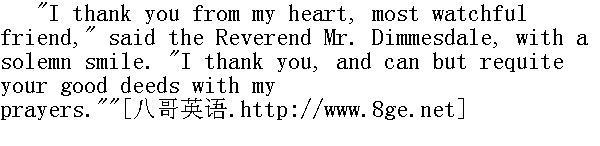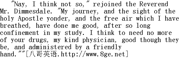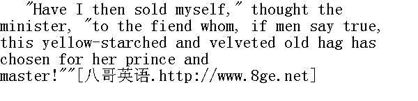 这样看来,我是不是已经把自己出卖给那个恶魔啦?"牧师思忖着,"如果人们所说属实,这个浆着黄领、穿着绒袍的老妖婆,早就选了那恶魔作她的王子和主人啦!" The wretched minister! He had made a bargain very like it! Tempted by a dream of happiness, he had yielded himself, with deliberate choice, as he had never done before, to what he knew was deadly sin. And the infectious poison of that sin had been thus rapidly diffused throughout his moral system. It had stupefied all blessed impulses, and awakened into vivid life the whole brotherhood of bad ones. Scorn, bitterness, unprovoked malignity, gratuitous desire of ill, ridicule of whatever was good and holy, all awoke, to tempt, even while they frightened him. And his encounter with old Mistress Hibbins, if it were a real incident, did but show his sympathy and fellowship with wicked mortals, and the world of perverted spirits. 这个不幸的牧师!他所作的那笔交易与此极其相似!他受着幸福的梦境的诱惑,经过周密的选择,居然前所未有地屈从于明知是罪大恶极的行径。面那桩罪孽的传染性毒素已经就此迅速扩散到他的整个道德体系,愚弄了一切神圣的冲动,而将全部恶念唤醒,变成活跃的生命。轻蔑、狠毒、无缘无故的恶言秽行和歹意;对善良和神圣的事物妄加嘲弄,这一切全都绘唤醒起来,虽说把他吓得要命,却仍在诱惑着他。而他和西宾斯老太太的不期而遇,如果当真只是巧合的话,也确实表明他已同恶毒的人们及堕落的灵魂的世界同流合污了。 He had, by this time, reached his dwelling, on the edge of the burial-ground, and, hastening up the stairs, took refuge in his study. The minister was glad to have reached this shelter, without first betraying himself to the world by any of those strange and wicked eccentricities to which he had been continually impelled while passing through the streets. He entered the accustomed room, and looked around him on its books, its windows, its fireplace, and the tapestried comfort of the walls, with the same perception of strangeness that had haunted him throughout his walk from the forest-dell into the town, and thitherward. Here he had studied and written; here, gone through fast and vigil, and come forth half alive; here striven to pray; here, borne a hundred thousand agonies! There was the Bible, in its rich old Hebrew, with Moses and the Prophets speaking to him, and God's voice through all! There, on the table, with the inky pen beside it, was an unfinished sermon, with a sentence broken in the midst, where his thoughts had ceased to gush out upon the page, two days before. He knew that it was himself, the thin and white-cheeked minister, who had done and suffered these things, and written thus far into the Election Sermon! But he seemed to stand apart, and eye this former self with scornful, pitying, but half-envious curiosity. That self was gone. Another man had returned out of the forest; a wiser one; with a knowledge of hidden mysteries which the simplicity of the former never could have reached. A bitter kind of knowledge that! 此时,他已走到坟场边上的住所,正在匆忙地踏上楼梯,躲进他的书斋中去一避。牧师能够进到这个庇荫之地,暗自高兴,因为这样一来,他就无须向世人暴露他在街上一路走来时那不断怂恿他的种种离奇古怪的邪念了。他走进熟悉的房间,环顾四周,看着室内的书籍、窗子、壁炉、接着壁毯的赏心悦目的墙壁,但从林中谷地进城来一路纠缠着他的同样的奇异感觉依然存在。他曾在这里研读和写作;他曾在这里斋戒和夜祷,以致弄得半死不活;他曾在这里尽心尽意地祈祷;他曾在这里忍受过成千上万种折磨!这里有那本装璜精美的《圣经》,上面用古老的希伯来文印着摩西和诸先知们对他的训戒,从头到尾全是上帝的声音!在桌上饱蘸墨水的鹅毛笔旁,摆着一篇未完成的布道词,一个句子写到中间就中断了,因为两天前他的思路再也涌不到纸上。他明知道那是他本人,两颊苍白、身材消瘦的牧师做的这些事、受的这些苦,写了这么些庆祝选举的布道文的!但他却象是站在一边,带着轻蔑和怜悯,而又怀着一些羡慕的好奇心,审视着先前的自己。那个自我已经一去不复返了,是另一个人从林中归来了,是具有神秘知识的男一个益发聪明的人了--那种知识是原先那人的简单头脑从来不可能企及的。那种知识真让人哭笑不得! While occupied with these reflections, a knock came at the door of the study, and the minister said, "Come in!"- not wholly devoid of an idea that he might behold an evil spirit. And so he did! It was old Roger Chillingworth that entered. The minister stood, white and speechless, with one hand on the Hebrew Scriptures, and the other spread upon his breast. 就在牧师沉浸在这些冥思苦想之中的时候,书斋的房门那儿传来一声敲门声,牧师便说道,"请进!"--并非完全没有料到他可能又要看到一个邪魔了。果不其然!进来的正是老罗杰·齐灵渥斯。牧师面包苍白、默默无言地站在那里,一手放在希伯来文鲍《圣经》上,另一只手则捂住心口。 "Welcome home, reverend sir," said the physician. "And how found you that godly man, the Apostle Eliot? But methinks, dear sir, you look pale; as if the travel through the wilderness had been too sore for you. Will not my aid be requisite to put you in heart and strength to preach your Election Sermon?"" 欢迎你回到家中,可敬的牧师先生,"医生说。"你看那位圣洁的艾略特使徒可好啊?可是我看你的样子很苍白,亲爱的先生;看来你在荒野中的这次旅行过于疲惫不堪了。要不要我来帮忙你恢复一下身心健康,以便在庆祝选举的布道中祈祷呢?"