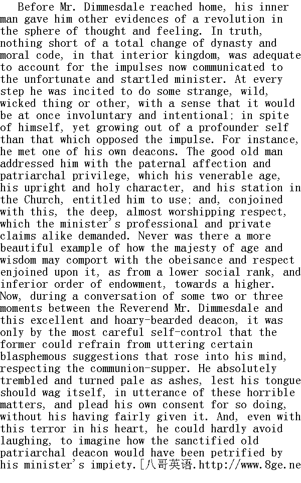 在丁梅斯代尔先生到家之前,他内心的那个人又给了他一些别的证据,说明在他的思想感情领域中已发生了彻底的变革。的确,若不是他心内的王国已经改朝换代、纲常全非的话,实在无法解释如今支配着不幸而惊惧的牧师的种种冲动。他每走一步,心中都想作出这样那样的出奇的、狂野的、恶毒的事情,他感到这种念头既非心甘情愿,却又有意为之;一方面是不由自主,然而另一方面又是发自比反对这种冲动更深层的自我。比如说,他遇见了他的一名执事,那位好心肠的老人用一种父辈的慈爱和家长般的资格跟他打招呼,那老人是由于具备受人尊敬的高龄、正直圣洁的品性和在教会由的地位所赋予的权利才这么做的;而与此相应的是,牧师则应报以深切并近乎崇拜的敬意,这同样是出于他的职业和个人品德所要求的作法。象这样社会地位较低和天赋能力较劣的人对高于自己者的毕恭毕敬,是年高德重之人如何使自己既有等严又有相应的礼敬的前所未有的绝好范例。此时,当丁梅斯代尔牧师先生和这位德高望重、须发灰白的执事谈话的片刻之间,牧师只是极其小心翼翼地控制自己,才不致把涌上心头的有关圣餐的某些亵渎神明的意思说出口来。他紧张得周身战抖,面色灰白,生怕他的舌头会不经他的认可,就会自作主张地说出那些可怕的言辞。然而,尽管他内心如此惧怕,但一想到假着他当真说出那番大不敬的话来,那位圣洁的父辈老执事会吓得何等瞠目结舌,他还是禁不住要笑出声来! Again, another incident of the same nature. Hurrying along the street, the Reverend Mr. Dimmesdale encountered the eldest female member of his church; a most pious and exemplary old dame; poor, widowed, lonely, and with a heart as full of reminiscences about her dead husband and children, and her dead friends of long ago, as a burial-ground is full of storied gravestones. Yet all this, which would else have been such heavy sorrow, was made almost a solemn joy to her devout old soul, by religious consolations and the truths of Scripture, wherewith she had fed herself continually for more than thirty years. And, since Mr. Dimmesdale had taken her in charge, the good grandam's chief earthly comfort- which, unless it had been likewise a heavenly comfort, could have been none at all- was to meet her pastor, whether casually, or of set purpose, and be refreshed with a word of warm, fragrant, heaven-breathing Gospel truth, from his beloved lips, into her dulled, but rapturously attentive ear. But, on this occasion, up to the moment of putting his lips to the old woman's ear, Mr. Dimmesdale, as the great enemy of souls would have it, could recall no text of Scripture, nor aught else, except a brief, pithy, and, as it then appeared to him, unanswerable argument against the immortality of the human soul. The instilment thereof into her mind would probably have caused this aged sister to drop down dead, at once, as by the effect of an intensely poisonous infusion. What he really did whisper, the minister could never afterwards recollect. There was, perhaps, a fortunate disorder in his utterance, which failed to impart any distinct idea to the good widow's comprehension, or which Providence interpreted after a method of its own. Assuredly, as the minister looked back, he beheld an expression of divine gratitude and ecstasy that seemed like the shine of the celestial city on her face, so wrinkled and ashy pale. 此外,还发生了另一件性质相同的事情。就在丁梅斯代尔先生匆匆沿街而行的时候,遇上了他的教堂中的一位最为年长的女教友,一位最虔诚诚和堪当楷模的老夫人;这位孤苦无依的寡妇的内心中,就象排满名人墓碑的莹地似的满怀对她已故的丈夫和子女,以及早已逝去的朋友的回忆。这一切本该成为深沉的悲哀的,但由于在长达三十余年的时间里,她不停地以宗教的慰藉和《圣经》的真理来充实自己,她在虔诚的年迈的心灵中,已经将这些回忆几乎视作一种肃穆的欢愉了。而由于丁梅斯代尔先生已经对她负起责任,这位好心的老太婆在世上的主要安慰--若不是这种今世的安慰也是一种天国的安慰,也就算不得数了--就是同她的牧师会面;不期而遇也罢,专程拜访也罢,只要能从他那可爱的双唇中说出片言只语的带有温馨的天国气息的福音真谛,送进她那虽已半聋却喜闻恭听的耳朵中,她就会精神焕然一新。然而,这一次,直到丁梅斯代尔先生把嘴唇凑近老妇人的耳畔之前,他竟如人类灵魂的大敌所愿,想不起《圣经》上的经文,也想不起别的,只是说了一句简练的反对人类灵魂不朽的话,他当时觉得这是无可辩驳的论点。这番话若是灌输到这位上了年纪的女教友的头脑之中,可能会象中了剧毒一样,让她立刻倒地死去。牧师到底耳语了些什么,他自己事后无论如何也追忆不起来了。或许,所好他语无伦次,未能使那好心的寡妇听明白什么清晰的含义,或许是上天按照自己的方式作出了解释。反正,当牧师回头看去时,只见到一副感谢天恩的狂喜神情,似乎天国的光辉正映照在她那满是皱纹的灰白色面孔之上。 Again, a third instance. After parting from the old church-member, he met the youngest sister of them all. It was a maiden newly won- and won by the Reverend Mr. Dimmesdale's own sermon, on the Sabbath after his vigil, to barter the transitory pleasures of the world for the heavenly hope, that was to assume brighter substance as life grew dark around her, and which would gild the utter gloom with final glory. She was fair and pure as a lily that had bloomed in Paradise. The minister knew well that he was himself enshrined within the stainless sanctity of 