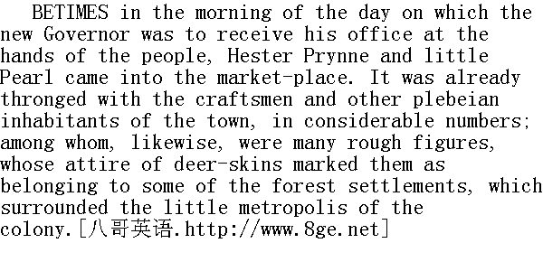 在新总督从人民手中接受他的职位的那天早晨,海丝特·白兰和小珠儿来到市场。那地方已然挤满了数量可观的工匠和镇上的其他黎民百姓;其中也有许多粗野的身形,他们身上穿的鹿皮衣装,表明他们是这个殖民地小都会周围的林中居民。 On this public holiday, as on all other occasions, for seven years past, Hester was clad in a garment of coarse grey cloth. Not more by its hue than by some indescribable peculiarity in its fashion, it had the effect of making her fade personally out of sight and outline; while, again, the scarlet letter brought her back from this twilight indistinctness, and revealed her under the moral aspect of its own illumination. Her face, so long familiar to the townspeople, showed the marble quietude which they were accustomed to behold there. It was like a mask; or, rather, like the frozen calmness of a dead woman's features; owing this dreary resemblance to the fact that Hester was actually dead, in respect to any claim of sympathy, and had departed out of the world with which she still seemed to mingle. 在这个公共假日里,海丝特和七年来的任何场合一样,仍然穿着她那身灰色粗布作的袍子。这身衣服的颜色,尤其是那说不出来的独特的样式,有一种使她轮廓模糊、不引人注目的效果;然而,那红字又使她从朦胧难辨之中跳出来,以其自身的闪光,把她显示在其精神之下。她那早巳为镇上居民所熟悉的面孔,露出那种常见的大理石般的静穆,伊如一副面具,或者更象一个亡妇脸上的那种僵死的恬静;如此令人沮丧的类比,是因为事实上海丝特无权要求任何同情,犹如实际上死去一般,她虽然看来似混迹于人间,确已经辞世。 It might be, on this one day, that there was an expression unseen before, nor, indeed, vivid enough to be detected now; unless some preternaturally gifted observer should have first read the heart, and have afterwards sought a corresponding development in the countenance and mien. Such a spiritual seer might have conceived, that, after sustaining the gaze of the multitude through seven miserable years as a necessity, a penance, and something which it was a stern religion to endure, she now, for one last time more, encountered it freely and voluntarily, in order to convert what had so long been agony into a kind of triumph. "Look your last on the scarlet letter and its wearer!"- the people's victim and life-long bond-slave, as they fancied her, might say to them. "Yet a little while, and she will be beyond your reach! A few hours longer, and the deep, mysterious ocean will quench and hide for ever the symbol which ye have caused to burn upon her bosom!" Nor were it an inconsistency too improbable to be assigned to human nature, should we suppose a feeling of regret in Hester's mind, at the moment when she was about to win her freedom from the pain which had been thus deeply incorporated with her being. Might there not be an irresistible desire to quaff a last, long, breathless draught of the cup of wormwood and aloes, with which nearly all her years of womanhood had been perpetually flavoured? The wine of life, henceforth to be presented to her lips, must be indeed rich, delicious, and exhilarating, in its chased and golden beaker; or else leave an inevitable and weary languor, after the lees of bitterness wherewith she had been drugged, as with a cordial of intensest potency. 这一天,她脸上或许有一种前所未见的表情,不过此时尚未清晰可察;除非有一个具备超自然秉赋的观察者能够首先洞悉她的内心,然后才会在她的表情和举止上找到相应的变化。这样一个能够洞悉内心的观察者或许可以发现,历经七年痛苦岁月,她将众目睽睽的注视作为一种必然、一种惩罚和某种宗教的严峻煎熬忍受着,如今,已是最后一次了,她要自由而自愿地面对人们的注视,以便把长期的苦难一变而为胜利。"再最后看一眼这红字和佩戴红字的人吧!"人们心目中的这个牺牲品和终身奴仆会对他们这样说。"不过再过一段时间,她就会远走高飞了!只消几个小时,那深不可测的大海将把你们在她胸前灼烧的标记永远淹没无存!"假如我们设想,当海丝特此时此刻即将从与她深深相联的痛苦中赢得自由时,心中可能会升起一丝遗憾之感,恐怕也并不有悼于人之本性。既然自从她成为妇人以来的多年中,几乎始终品尝着苦艾和芦荟,难道这时就不会有一种难以逼止的欲望要最后一次屏住气吸上一大杯这种苦剂吗?今后举到她唇边的、盛在雕花的金色大杯中的生活的美酒,肯定是醇厚、馥郁和令人陶醉的;不然的话,在她喝惯了具有强效的兴奋剂式的苦酒渣之后,必然会产生一种厌烦的昏昏然之感。 Pearl was decked out with airy gaiety. It would have been impossible to guess that this bright and sunny apparition owed its existence to the shape of gloomy grey; or that a fancy, at once so gorgeous and so delicate as must have been requisite to contrive the child's apparel, was the same that had achieved a task perhaps more difficult, in imparting so distinct a peculiarity to Hester's simple robe. The dress, so proper was it to little Pearl, seemed an effluence, or inevitable development and outward manifestation of her character, no more to be separated from her than the many-hued brilliancy from a butterfly's wing, or the painted glory from the leaf of a bright flower. As with these, so with the child; her garb was all of one idea with her nature. On this eventful day, moreover, there was a certain singular inquietude and excitement in her mood, resembling nothing so much as the shimmer of a diamond, that sparkles and flashes with the varied throbbings of the breast on which it is displayed. Children have always a sympathy in the agitations of those connected wi
