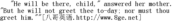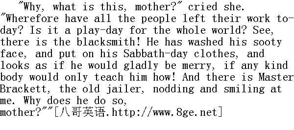 咦,这是什么啊,妈妈?"她叫道。"大伙儿干嘛今天都不干活儿啦?今天全世界都休息吗?瞧啊,铁匠就在那儿!他洗掉了满脸煤烟,穿上了过星期日的衣服,象是只要有个好心人教教他,就要痛痛快快地玩玩哪!那位老狱吏布莱基特先生,还在那儿朝我点头微笑呢。他干嘛要这样呢,妈妈?" "He remembers thee a little babe, my child," answered Hester. " 他还记得你是个小小的婴儿的样子呢,我的孩子,"海丝特回答说。 "He should not nod and smile at me for all that- the black, grim, ugly-eyed old man!" said Pearl. "He may nod at thee, if he will; for thou art clad in grey, and wearest the scarlet letter. But see, mother, how many faces of strange people, and Indians among them, and sailors! What have they all come to do, here in the market-place?" " 那个长得又黑又吓人、眼睛很丑的老头儿,才不会因为这个对我点头微笑呢!"珠儿说。"他要是愿意,倒会向你点头的;因为你穿一身灰,还戴着红字。可是瞧啊,妈妈,这儿有多少生人的面孔啊,里边还有印第安人和水手呢!他们都到这市场上来干嘛呢?" "They wait to see the procession pass," said Hester. "For the Governor and the magistrates are to go by, and the ministers, and all the great people and good people, with the music and the soldiers marching before them."" 他们等着看游行队伍经过,"海丝特说。"因为总督和官员们要从这里走过,还有牧师们,以及所有的大人物和好心人,前面要有乐队和士兵开路呢。" "And will the minister be there?" asked Pearl. "And will he hold out both his hands to me, as when thou ledst me to him from the brook-side?"" 牧师会在那儿吗?"珠儿问。"他会朝我伸出双手,就象你从小河边领着我去见他的时候那样吗?"