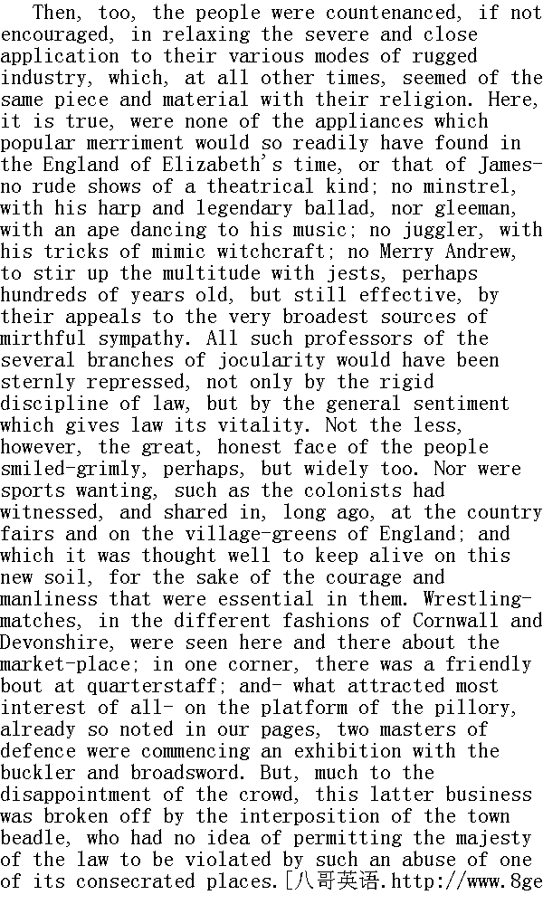在这种时刻,人们平日视如宗教教义一般严加施行的种种勤俭生活方式,即使没有受到鼓励吧,总可以获准稍加放松。诚然,这里没有伊丽莎白时代或詹姆斯时代在英国比比皆是的通俗娱乐设施,没有演剧之类的粗俗表演,没有弹着竖琴唱传奇歌谣的游吟诗人,没有奏着音乐耍猴的走江湖的人,没有变戏法的民间艺人,也没有逗得大家哄堂大笑的"快乐的安德鲁"①说那些由于笑料选出、虽已流传上百年、仍让人百听不厌的笑话。从事这种种滑稽职业的艺人们,不仅为严格的法律条文所严厉禁止,也遭到使法律得以生效的人们感情上的厌恶。然而,普通百姓那一本正经和老成持重的面孔上依然微笑着,虽说可能有点不自然,却也很开心。竞技活动也不算缺乏,诸如移民们好久以前在英国农村集市和草地上看到和参加的格斗比赛,由于本质上发扬了英武和阳刚精神,被视为应于这片新大陆上加以保留。在康沃尔和德文郡的种种形式的角力比赛,在这里的市场周围随处可见;在一个角落里,正在进行一场使用铁头木棍作武器的友谊较量;而最吸引大家兴趣的,是在刑台上--这地方在我们书中已经颇为注目了,有两位手执盾牌和宽剑的武士,正在开始一场公开表演。但是,使大家扫兴的是,刑台上的这场表演因遭到镇上差役的干涉而中断,他认为对这祭献之地妄加滥用,是侵犯了法律的尊严,是绝对不能允许的。 It may not be too much to affirm, on the whole (the people being then in the first stages of joyless deportment, and the offspring of sires who had known how to be merry, in their day), that they would compare favourably, in point of holiday keeping, with their descendants, even at so long an interval as ourselves. Their immediate posterity, the generation next to the early emigrants, wore the blackest shade of Puritanism, and so darkened the national visage with it, that all the subsequent years have not sufficed to clear it up. We have yet to learn again the forgotten art of gaiety. 当时的居民还是第一代没有欢乐活动的人,而且又是那些活着时深诸如何行乐曲父辈们的直接后裔,就过节这一点而论,比起他们的子孙,乃至相隔甚久的我们这些人,算是懂得快活的了,我们作这种一般性的结论,恐怕并不过分。早期移民的子嗣,也就是他们的下一代后人,受清教主义阴影笼罩最深,从而使国家的形象黯淡无光,以致在随后的多年中都不足以清洗干净。我们只好重新学习这门忘却已久的寻欢作乐曲本领。 The picture of human life in the market-place, though its general tint was the sad grey, brown, or black of the English emigrants, was yet enlivened by some diversity of hue. A party of Indians- in their savage finery of curiously embroidered deer-skin robes, wampum-belts, red and yellow ochre, and feathers, and armed with the bow and arrow and stone-headed spear- stood apart, with countenances of inflexible gravity, beyond what even the Puritan aspect could attain. Nor, wild as were these painted barbarians, were they the wildest feature of the scene. This distinction could more justly be claimed by some mariners-a part of the crew of the vessel from the Spanish Main- who had come ashore to see the humours of Election Day. They were rough-looking desperadoes, with sun-blackened faces, and an immensity of beard; their wide, short trousers were confined about the waist by belts, often clasped with a rough plate of gold, and sustaining always a long knife, and, in some instances, a sword. From beneath their broad-brimmed hats of palm-leaf, gleamed eyes which, even in good-nature and merriment, had a kind of animal ferocity. They transgressed, without fear or scruple, the rules of behaviour that were binding on all others; smoking tobacco under the beadle's very nose, although each whiff would have cost a townsman a shilling; and quaffing, at their pleasure, draughts of wine or aqua-vitae from pocket-flasks, which they freely tendered to the gaping crowd around them. It remarkably characterised the incomplete morality of the age, rigid as we call it, that a license was allowed the seafaring class, not merely for their freaks on shore, but for far more desperate deeds on their proper element. The sailor of that day would go near to be arraigned as a pirate in our own. There could be little doubt, for instance, that this very ship's crew, though no unfavourable specimens of the nautical brotherhood, had been guilty, as we should phrase it, of depredations on the Spanish commerce, such as would have perilled all their necks in a modern court of justice. 市场上的这幅人生图画,虽说基调是英国移民的忧伤的灰色、褐色和黑色,也还固间有一些其它色彩而显得活跃。一群印第安人,身穿有着野蛮人华丽的、绣着奇形怪状图案的鹿皮袍,腰束贝壳缀成的带子,头戴由红色和黄色赭石及羽毛做成的饰物,背挎弓箭,手执石尖长矛,站在一旁,他们脸上那种严肃刚毅的神情,比清教徒们还有过之而无不及。但这些周身涂得花花绿绿的野蛮人,还算不上当场最粗野的景象;更能充分表现这一特色的,是一批从那艘来自拉丁美洲北部海域的船上的水手,他们上岸来就是为了观看庆祝选举日的热闹的。他们是一伙外貌粗鲁的亡命之徒,个个面孔晒得黝黑,蓄着大胡子;又肥又短的裤子在腰间束着宽腰带,往往用一片粗金充当扣子,总是插着一柄长刀,偶尔是短剑。宽檐棕榈叶帽子下面闪着的那双眼睛,即使在心情好、兴致高的时候,也露出一股野兽般的凶光。他们肆元忌惮地违犯着约束着众人的行为准则;公然在差役的鼻子底下吸烟,尽管镇上人每这样吸上一日就要被罚一先令;他们还随心所欲地从衣袋里掏出