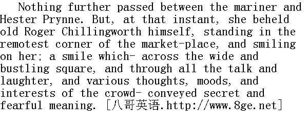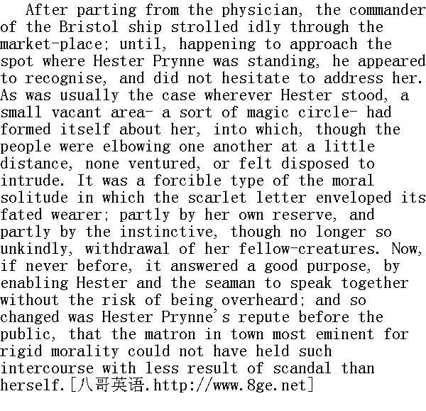 准备开往布利斯托尔的那艘船的船长,和医生分手后,就悠闲地踱过市场;后来他刚好走近海丝特·白兰站立的地方,他好象认识她,径直上前去打招呼。和通常一样,凡是海丝特所站之处,周围就会形成一小块空地,似乎有一种魔圈围着,圈外的人尽管在附近摩肩擦背地挤作一团,也没人甘冒风险或乐于闯进那块空地。这正是红字在注定要佩戴它的人四周所形成的一种强制性的精神上的孤立;这固然是由于她自己的回避,但也是由于她的同胞们的本能的退缩,尽管这种退缩早已不那么不友好了。如果说这种隔离圈以前毫无裨益的话,此时倒是大有好处,因为海丝特能够同那位船长交谈而不致冒被人听到的风险j何况海丝特·白兰在众人间的声名已经大有改变,即使是镇上以恪守妇道最为著称的妇人进行这种谈话,都不会比她少受风言风语的指责。 "So, mistress," said the mariner, "I must bid the steward make ready one more berth than you bargained for! No fear of scurvy or ship-fever, this voyage! What with the ship's surgeon and this other doctor, our only danger will be from drug or pill; more by token, as there is a lot of apothecary's stuff aboard, which I traded for with a Spanish vessel."" 啊,太太,"船长说,"我得让船员在你要求的席位之外,再多安排一个!那就不必担心路上得坏血症或斑疹伤寒这类疾病了!有了船上的外科医生和另外这位医生,我们唯一的危险就差药剂或药丸了;其实,我船上还有一大批药物,是跟一艘西班牙船换的。" "What mean you?" inquired Hester, startled more than she permitted to appear. "Have you another passenger?"" 你这是什么意思啊?"海丝特问道,脸上禁不佳露出了惊诧神色。"你还有另一位乘客吗?" "Why, know you not," cried the shipmaster, "that this physician here- Chillingworth, he calls himself- is minded to try my cabin-fare with you? Ay, ay, you must have known it; for he tells me he is of your party, and a close friend to the gentleman you spoke of- he that is in peril from these sour old Puritan rulers!"" 怎么,你还不知道?"船长大声说,"这儿的这位医生--他自称齐灵渥斯--打算同你一道尝尝我那船上饭菜的滋味呢,唉,唉,你准已经知道了;因为他告诉我,他是你们的一伙,还是你提到的那位先生的密友呢--你不是说那位先生正受着这些讨厌的老清教徒统治者的迫害嘛!" "They know each other well, indeed," replied Hester, with a mien of calmness, though in the utmost consternation. "They have long dwelt together."" 的确,他们彼此很了解,"海丝特神色平静地回答说,尽管内心十分惊愕。"他们已经在一起往了好久了。"