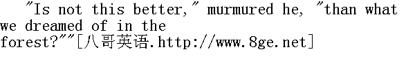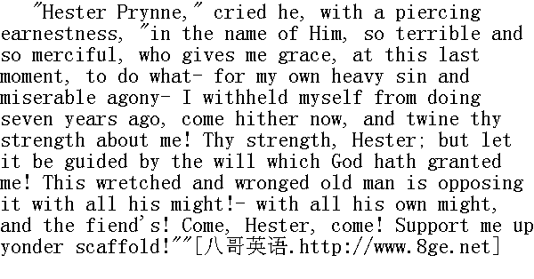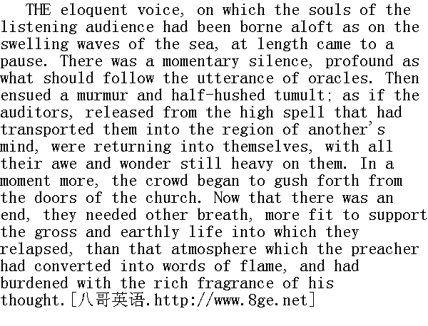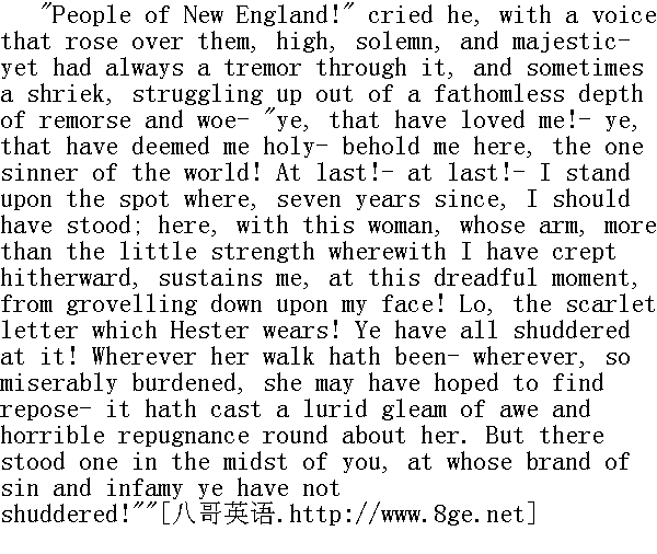 犹如汹涌的海港般载着听众的灵魂高高升起的雄辩的话音,终于告一段落。那一刹那的静穆,如同宣告了神谕之后一般深沉。随后便是一阵窃窃私语和压低嗓门的瞳哗;似乎听众们从把他们带到另中种心境去的高级咒语中解脱出来,如今依然怀着全部惊惧的重荷重新苏醒了。过了一会儿,人群便开始从教堂的大门蜂拥而出。如今布道已经结束,他们步出被牧师化作火一般语言的、满载着他思想的香馥的气氛,需要换上另一种空气,才更适合支持他们的世俗生活。 In the open air their rapture broke into speech. The street and the market-place absolutely babbled, from side to side, with applauses of the minister. His hearers could not rest until they had told one another of what each knew better than he could tell or hear. According to their united testimony, never had man spoken in so wise, so high, and so holy a spirit, as he that spake this day; nor had inspiration ever breathed through mortal lips more evidently than it did through his. Its influence could be seen, as it were, descending upon him, and possessing him, and continually lifting him out of the written discourse that lay before him, and filling him with ideas that must have been as marvellous to himself as to his audience. His subject, it appeared, had been the relation between the Deity and the communities of mankind, with a special reference to the New England which they were here planting in the wilderness. And, as he drew towards the close, a spirit as of prophecy had come upon him, constraining him to its purpose as mightily as the old prophets of Israel were constrained; only with this difference, that, whereas the Jewish seers had denounced judgments and ruin on their country, it was his mission to foretell a high and glorious destiny for the newly gathered people of the Lord. But, throughout it all, and through the whole discourse, there had been a certain deep, sad undertone of pathos, which could not be interpreted otherwise than as the natural regret of one soon to pass away. Yes; their minister whom they so loved- and who so loved them all, that he could not depart heavenward without a sigh- had the foreboding of untimely death upon him, and would soon leave them in their tears! This idea of his transitory stay on earth gave the last emphasis to the effect which the preacher had produced; it was as if an angel, in his passage to the skies, had shaken his bright wings over the people for an instant- at once a shadow and a splendour- and had shed down a shower of golden truths upon them. 来到户外,他们如醉如痴的狂喜进发成语言。街道上、市场中、到处都翻腾着对牧师的腆美之词。他的听众们滔滔不绝地彼此诉说着每个人所知道的一切,直到全都说尽听够为止。他们异口同声地断言,从来没有淮象他今天这样讲得如此睿智、如此祟高、如此神圣;也没有哪个凡人的口中能够象他这样吐出如此鲜明的启示。显而易见,那启示的力量降临到了他身上,左右着他,不断地把他从面前的讲稿上提高,并以一些对他本人和对听众都妙不可言的观念充实着他。他所讲的主题音乐是上帝与人类社会的关系,尤指他们在这里垦荒播种的新英格兰。当他的布道接近结尾的时候,似是预言的一种精神降临在他身上,如同当年支配着以色列的老预言家一样强有力地迫使他就范;唯一不同的是,犹太人预言家当年宣告的是他们国内的天罚和灭亡,而他的使命则是预示新近在这里集结起来的上帝的臣民们的崇高而光荣的命运。但是,贯穿布道词始终的,一直有某种低沉、哀伤的悲调,使人们只能将其解释为一个即将告别人世的人的自然的仟悔。是啊;他们如此爱戴、也如此热爱他们的牧师不能不叹息一声就离开他们飞向天国啊!他们的牧师已经预感到那不合时宜的死亡的降临,很快就要在他们的哭声中离他们而去了!想到牧师弥留世上的时间已经不长,他那番布道词所产生的效果就更增加了最终强调的力量;如同一个天使在飞往天国的途中在人们的头上扇动了一下明亮的翅膀,随着一片阴影和一束光彩,向他们洒下了一阵黄金般的真理。 Thus, there had come to the Reverend Mr. Dimmesdale- as to most men, in their various spheres, though seldom recognised until they see it far behind them- an epoch of life more brilliant and full of triumph than any previous one, or that any which could hereafter be. He stood, at this moment, on the very proudest eminence of superiority, to which the gifts of intellect, rich lore, prevailing eloquence, and a reputation of whitest sanctity, could exalt a clergyman in New England's earliest days, when the professional character was of itself a lofty pedestal. Such was the position which the minister occupied, as he bowed his head forward on the cushions of the pulpit, at the close of his Election Sermon. Meanwhile Hester Prynne was standing beside the scaffold of the pillory, with the scarlet letter still burning on her breast! 于是,丁梅斯代尔牧师先生来到了他一生中空前绝后的最辉煌也是最充满胜利的时期,许多人在他们不同的领域里也曾有过这样的时期;只是经过好久以后他们往往才意识到。此时,他是站在最骄傲的卓越地位之上,在早期的新英格兰,牧师这一职业本身已然是一座高高的础座,而一个牧师要想达到他如今那种高度,还有赖于智慧的天赋、丰富的学识、超凡的口才和最无理的圣洁的名声。当我们的这位牧师结束了他在庆祝选举日的布道,在讲坛的靠垫上向前垂着头时,所处的正是这样一个高位。与此同时,海丝特·白兰却站在刑台的旁边,胸前依然灼烧着红字! Now was heard again the clangour of the music, and the measured 