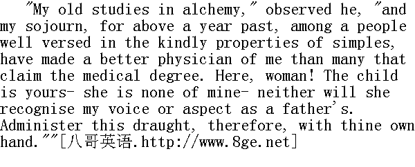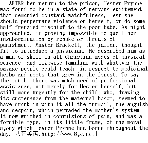 海丝特·白兰返回监狱之后,便陷入一阵神经质的激动之中,必须有人片刻不离地看守着她,以防止她作出自戕之举,或在一时狂乱之中对可怜的婴儿有所伤害。夜幕将临,人们发现无论是大声呵斥抑或是以惩罚作威胁,对于她的不顺从都无济于事,看守布莱基特先生便主张请一个医生来给她看看。按照他的介绍,那医生不但精通基督教的各种医术,面且熟谙从野蛮人那里学来的长在林间的一切草药。老实讲,需要医生诊治的,不仅是海丝特本人,倒是那孩子更为急迫。由于她要从母亲的乳汁中汲取营养,似乎同时吸进了渗透在母亲肌体中的一切骚动、痛楚和绝望。此时,她正在痛苦的痉挛中扭动着,那小小的身躯成了海丝特·白兰一天中所忍受的精神上的极度痛苦的有力的具体表现。 Closely following the jailer into the dismal apartment, appeared that individual of singular aspect, whose presence in the crowd had been of such deep interest to the wearer of the scarlet letter. He was lodged in the prison, not as suspected of any offence, but as the most convenient and suitable mode of disposing of him, until the magistrates should have conferred with the Indian sagamores respecting his ransom. His name was announced as Roger Chillingworth. The jailer, after ushering him into the room, remained a moment, marvelling at the comparative quiet that followed his entrance; for Hester Prynne had immediately become as still as death, although the child continued to moan. 那个外表奇特的陌生人紧跟在看守身后走进了凄凉的牢房,他上午在人群中露面的时候,曾经引起了红字佩戴者的深切注意。长官们后来安排他暂时栖身狱中,倒不是担心他会作出什么有害之举,而是在和印第安头人们协商他的赎身问题之前,只有如此才最为方便妥善。据称他名叫罗杰·齐灵渥斯。看守把他领进牢房之后,刚逗留了片刻,室内居然随那人的到来而安静下来,使看守颇为诧异;此时婴儿虽然依旧呻唤不止,海丝特·白兰却立刻象死去一般地僵呆了。 "Prithee, friend, leave me alone with my patient," said the practitioner. "Trust me, good jailer, you shall briefly have peace in your house; and, I promise you, Mistress Prynne shall hereafter be more amenable to just authority than you may have found her heretofore."" 朋友,请让我和我的病人单独呆一会儿,"那医生说道。"请相信我吧,好看守,你管的这间牢房很快就会安静下来的;而且我还向你保证,白兰太太将从此遵从执法长官,不会再象原先那样了。" "Nay, if your worship can accomplish that," answered Master Brackett, "I shall own you for a man of skill indeed! Verily, the woman hath been like a possessed one; and there lacks little, that I should take in hand to drive Satan out of her with stripes."" 嘿,要是你老先生能够做到这一条,"布莱基特看守回答说,"我可要承认你真是手到病除了!真的,这女人一直象是魔鬼缠身;我简直使尽了招数,就差用鞭子把撤旦从她身上赶走啦。" The stranger had entered the room with the characteristic quietude of the profession to which he announced himself as belonging. Nor did his demeanour change, when the withdrawal of the prison keeper left him face to face with the woman, whose absorbed notice of him, in the crowd, had intimated so close a relation between himself and her. His first care was given to the child; whose cries, indeed, as she lay writhing on the trundle-bed, made it of peremptory necessity to postpone all other business to the task of soothing her. He examined the infant carefully, and then proceeded to unclasp a leathern case, which he took from beneath his dress. It appeared to contain medical preparations, one of which he mingled with a cup of water. 陌生人心平气和地走进牢房,那态度倒和他自称的医生职业相称。看守退出以后,只剩他和那女人面面相对时,他依然平静如初,尽管她在人群中曾经那么专注地望着他,已经说明他俩之间的关系密切异常。他先诊视那孩子,是啊,那婴儿躺在轮床上辗转哭泣,使他不能不撇下其它,把平息她作为当务之急,他仔细地诊视了孩子,然后从怀里掏出一个皮匣。里面象是装着药物,他取出一粒,搅进一杯水里。